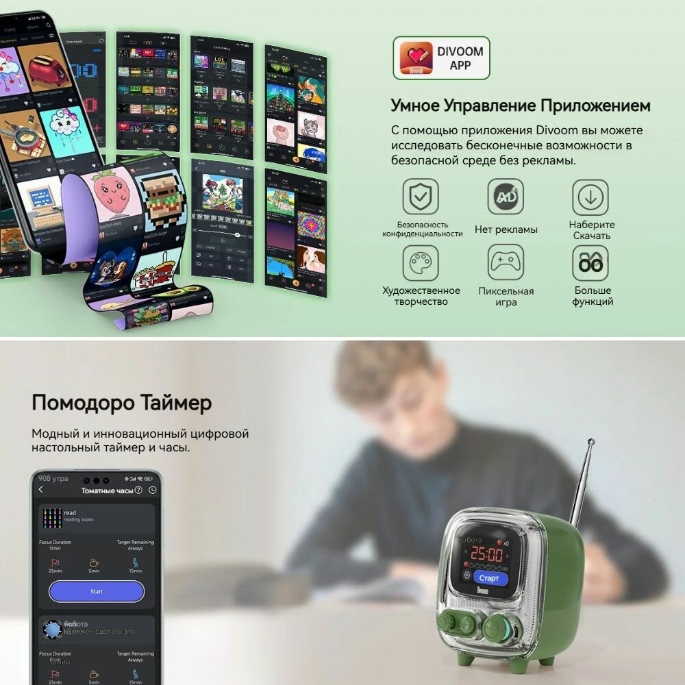 - Ретро-дизайн сочетается с современными технологиями: Демонстрируя уважение к классическим традиционным компьютерам 90-х годов, Divoom представляет ретро-радио tiivoo-2 с FM-динамиком Bluetooth, переосмысливая старомодные телевизоры. Обновленный радиоприемник Divoom tiivoo-2 обладает множеством функций, таких как цифровая фоторамка в режиме реального времени, таймер pomodoro, более 80 динамических циферблатов, белый шум, будильник, более 15 забавных ретро-игр и другие функции, которые можно найти в приложении Divoom.