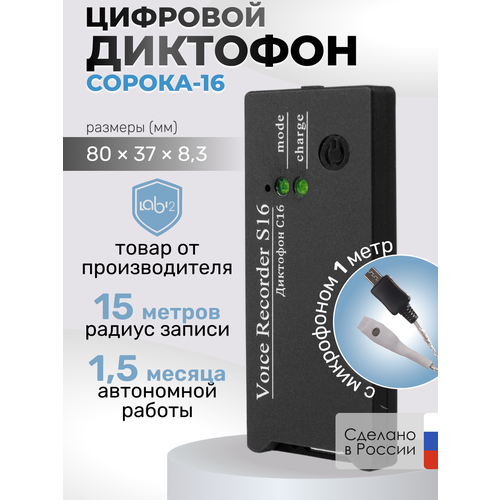 Диктофон "Сорока-16" - это высококачественный цифровой диктофон, который обеспечивает продолжительность работы до 1122 минут. Он оснащен функцией активизации по голосу, что позволяет начать запись при обнаружении звука.