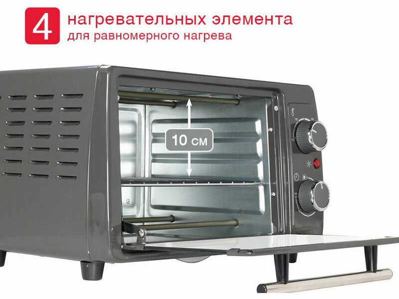 Компактная мини-печь MO1020 Oursson объемом 10 литров - это отличная альтернатива духовке для одного человека или небольшой семьи. Механическое управление обеспечивает простую установку температуры (100-250С) и таймера со звуковым сигналом (до 60 минут). Печь снабжена четырьмя нагревательными элементами (два сверху и два снизу), которые создают равномерный нагрев. Дно печи открывается, его легко почистить. Глянцевая поверхность прибора гармонично дополнит дизайн вашей кухни. В комплекте: противень, решетка, держатель.