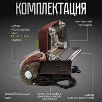 Шлифовальный станок заменит вам шлифовальные инструменты при изготовлении украшений. Блок питания, который поставляется в комплекте, позволяет регулировать скорость вращения от 4000 до 9000 об/мин. Наличие в комплекте 10 шлифовальных лент с разной степенью зернистости (120, 240, 400, 800, 1000 - по 2 шт. каждой) позволит выполнять зачистку, обдирку и контуровку для изделий ручной работы.