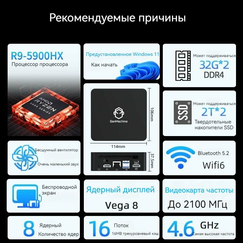 Мини — компьютер GenMachine AMD R5-5900HX Mini PC Windows 11 Pro 2*DDR4 3200Mhz Business Office Design Computer 32G+2TB: сравнение цен, характеристики, фото, актуальное наличие и цены.