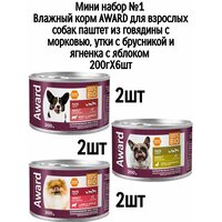 Мини набор №1 Влажный корм Award для взрослых собак паштет из ягненка, говядины и утки, 6 шт х 200 гр (3 вкуса по 2 шт)