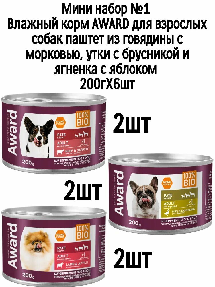 Мини набор №1 Влажный корм Award для взрослых собак паштет из ягненка, говядины и утки, 6 шт х 200 гр (3 вкуса по 2 шт): сравнение цен, характеристики, фото, актуальное наличие и цены.