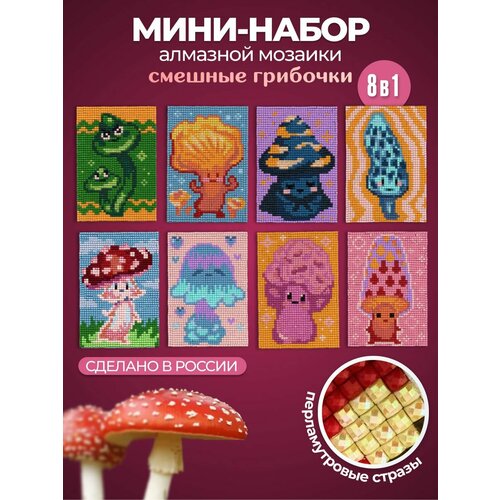 Добро пожаловать в грибное королевство! В мини-наборе алмазной мозаики — 8 забавных грибочков с характером: улыбающиеся, задумчивые, с щёчками, в шляпках и ботиночках. Каждый сюжет выполнен в стиле пиксель арт и собирается из сияющих перламутровых gems, создающих эффектный алмазный ряд. Алмазная мозаика маленькая, но невероятно выразительная — она поднимает настроение и вдохновляет на творчество. Алмазная мозаика мини картинки легко собирается даже новичками, подойдёт и детям, и взрослым. Мозаика по номерам маленькая — компактный и весёлый формат для отдыха, поездки или подарка. Набор мини алмазной мозаики включает квадратные стразы, клей, стилус, лоток и схемы по номерам. Алмазная мозаика много маленьких сюжетов с грибами в одном комплекте — максимум удовольствия. Подарочный набор алмазной мозаики со смешными грибочками — это креатив, уют и капелька волшебства на вашем столе.