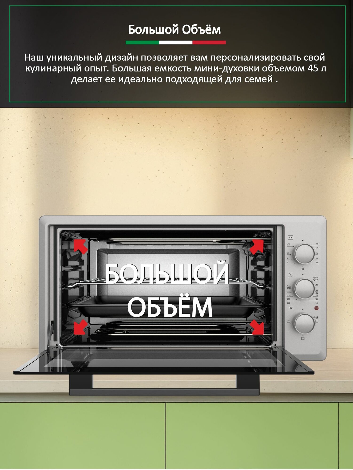 Эта мини-печь отлично подойдет как для выпечки, так и для запекания мясных и овощных блюд. Благодаря своим компактным размерам, она станет отличным выбором для небольших кухонь, дач или для тех, кто ценит удобство и функциональность. Подготовьте вкусные и ароматные блюда с легкостью, используя эту надежную и практичную технику.