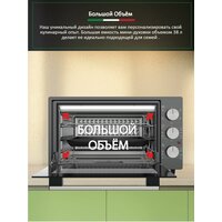 Объем в 38 литров предоставляет достаточно пространства для приготовления еды на гарнир или запеканок, а два противня и хромированная решетка в комплекте обеспечивают удобство в процессе приготовления. Турбовентилятор гарантирует быструю циркуляцию горячего воздуха, что значительно ускоряет процесс запекания и предотвращает образование холодных зон внутри устройства.