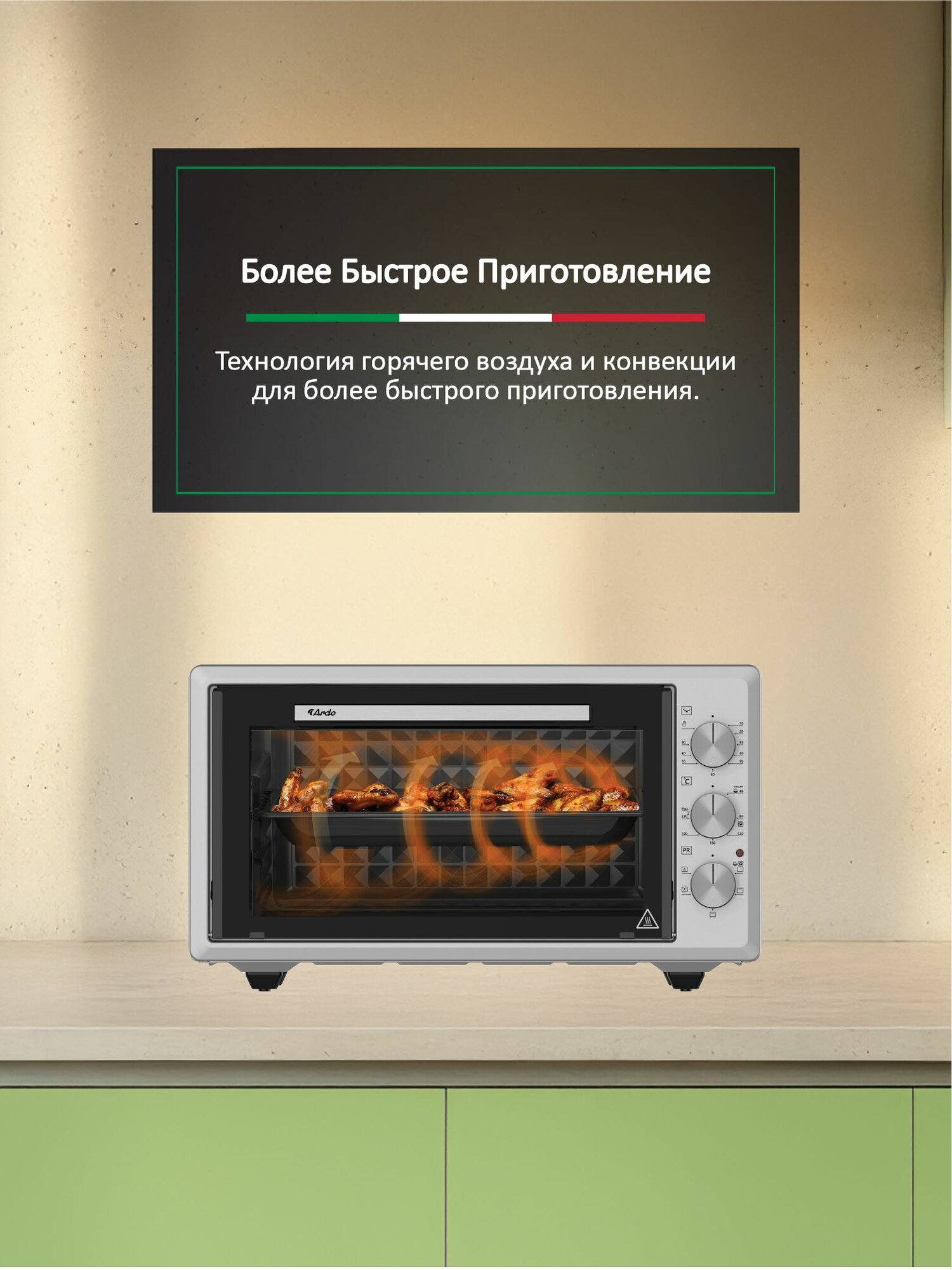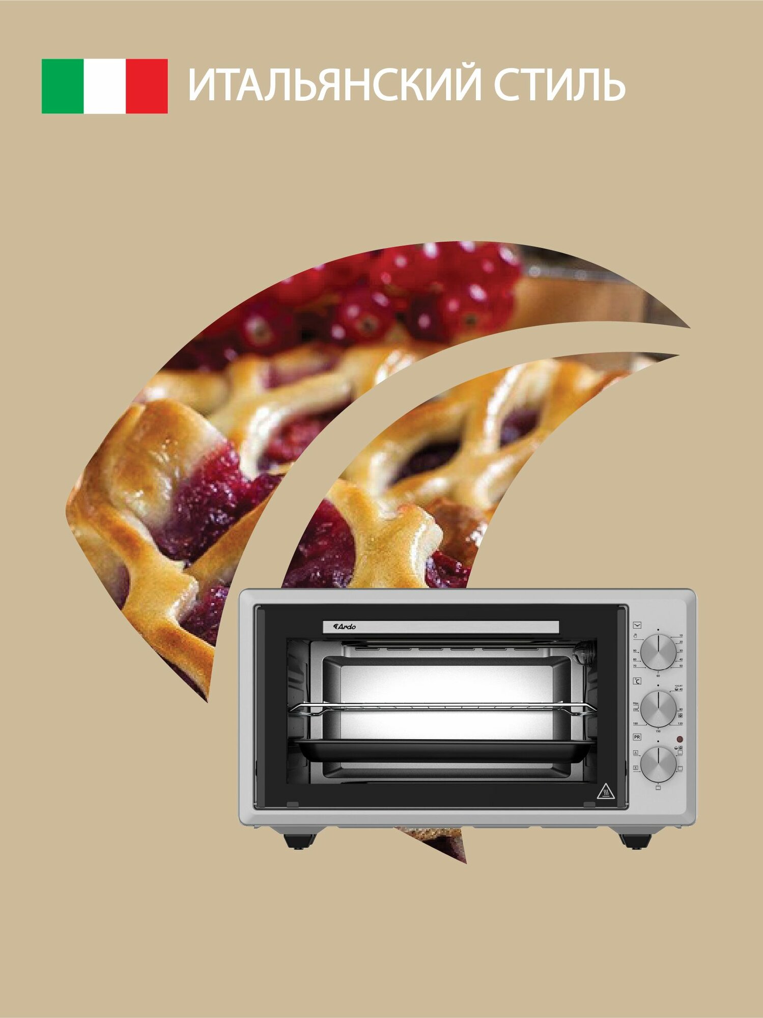 45 л• 5 функций• Механический таймер (90 мин.)• Двойная стеклянная дверца• 1 стандартный эмалированный квадратный противень + 1 решетка + 1 эмалированный круглый противень• Цвет: металлический серый• ТурбовентиляторЭта электрическая мини печь объемом 45 литров идеально сочетает в себе передовые функции и элегантный дизайн, что делает её отличным выбором для вашей кухни. Оснащенная механическим таймером, который позволяет устанавливать время готовки до 90 минут, она обеспечивает точное и удобное управление процессом приготовления пищи. Мини печь предлагает шесть функций, включая гриль, конвекцию, выпечку, подогрев и другие, что делает её универсальным инструментом для разнообразных кулинарных задач. Турбовентилятор обеспечивает равномерное распределение тепла для достижения идеальных результатов при готовке. Двойная стеклянная дверца обеспечивает отличную теплоизоляцию и позволяет удобно наблюдать за процессом приготовления, не открывая дверцу и не теряя тепло. В комплект входят один стандартный эмалированный квадратный противень, один эмалированный круглый противень и одна решетка.
