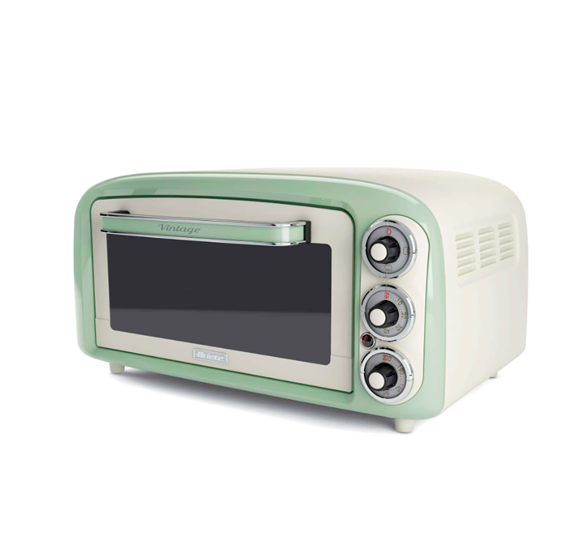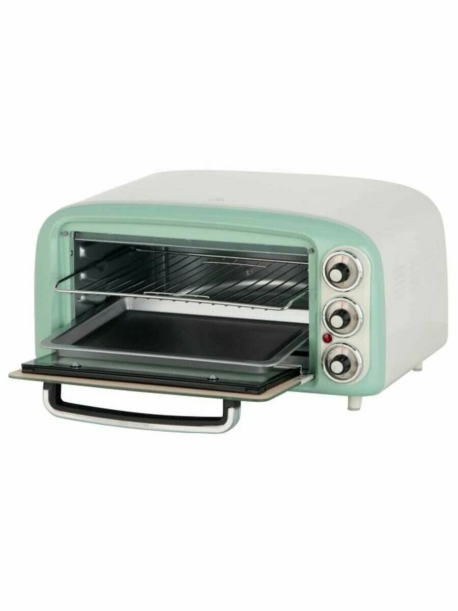 Мини-печь Ariete Vintage 979 Зеленый, емкость 18 литров, идеально подходит для приготовления пиццы благодаря увеличенному дну. В комплекте идет стальная решетка и алюминиевый поддон, регулируемый таймер с запасом времени до 60 минут с сигналом окончания и устанавливаемой температурой до 230 ° C. Печь имеет 3 режима приготовления (верхний жар, нижний жар, верхний и нижний жар). Дверца укомплектована двойным жаропрочным стеклом.