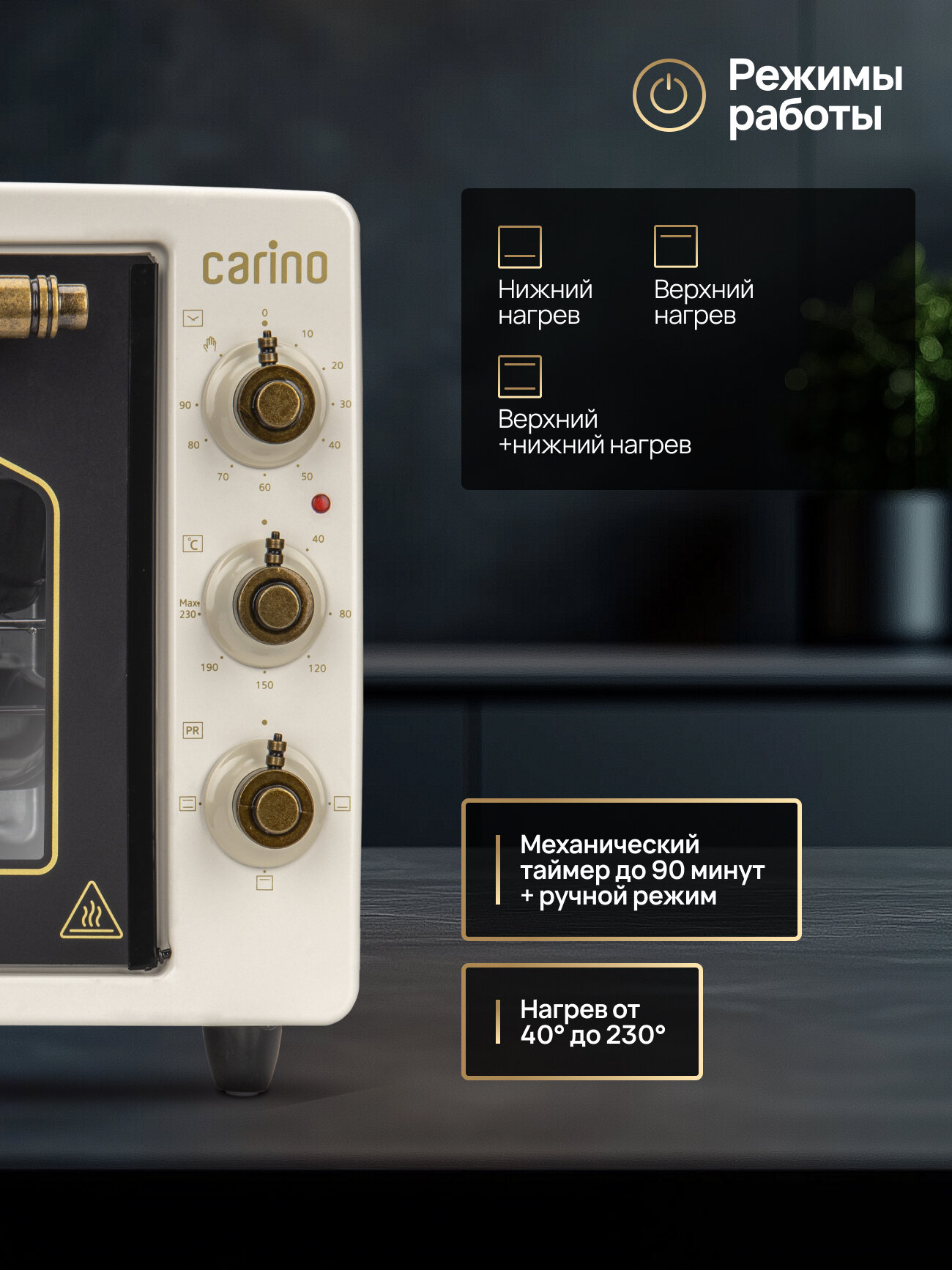 Механический таймер до 90 минут с возможностью ручного регулирования температуры от 40 до 230 обеспечивает полный контроль над приготовлением.