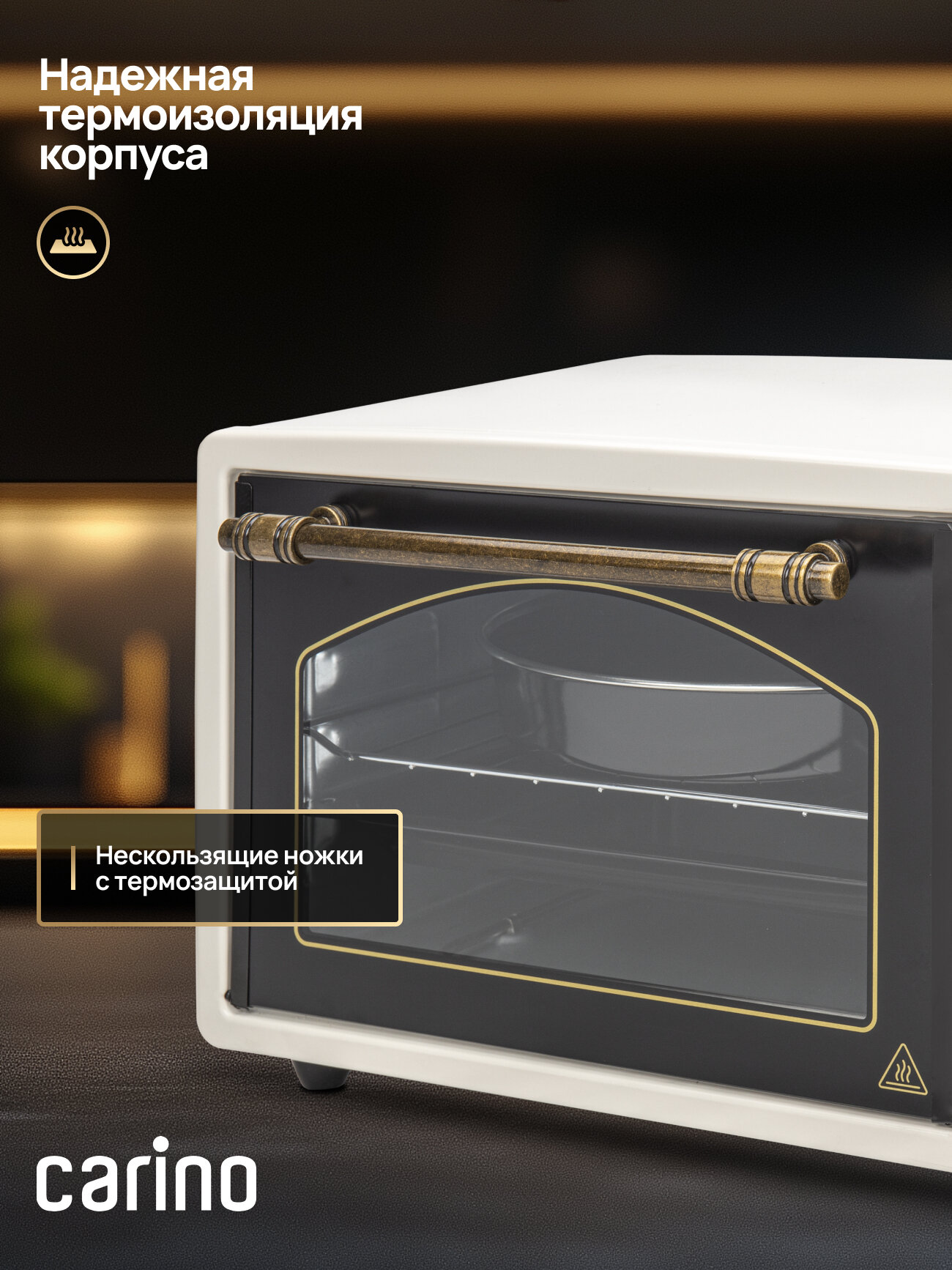 Эффективная теплоизоляция: одинарное стекло и термоизоляция корпуса с нескользящими ножками обеспечивают безопасность использования и удержание тепла внутри печи.