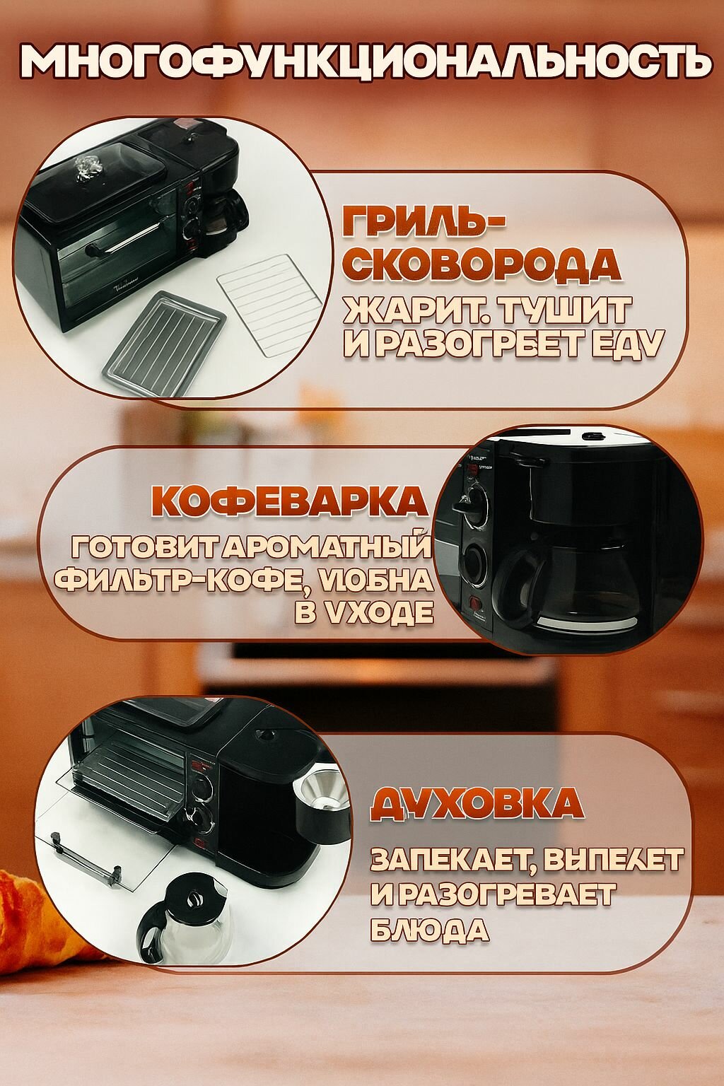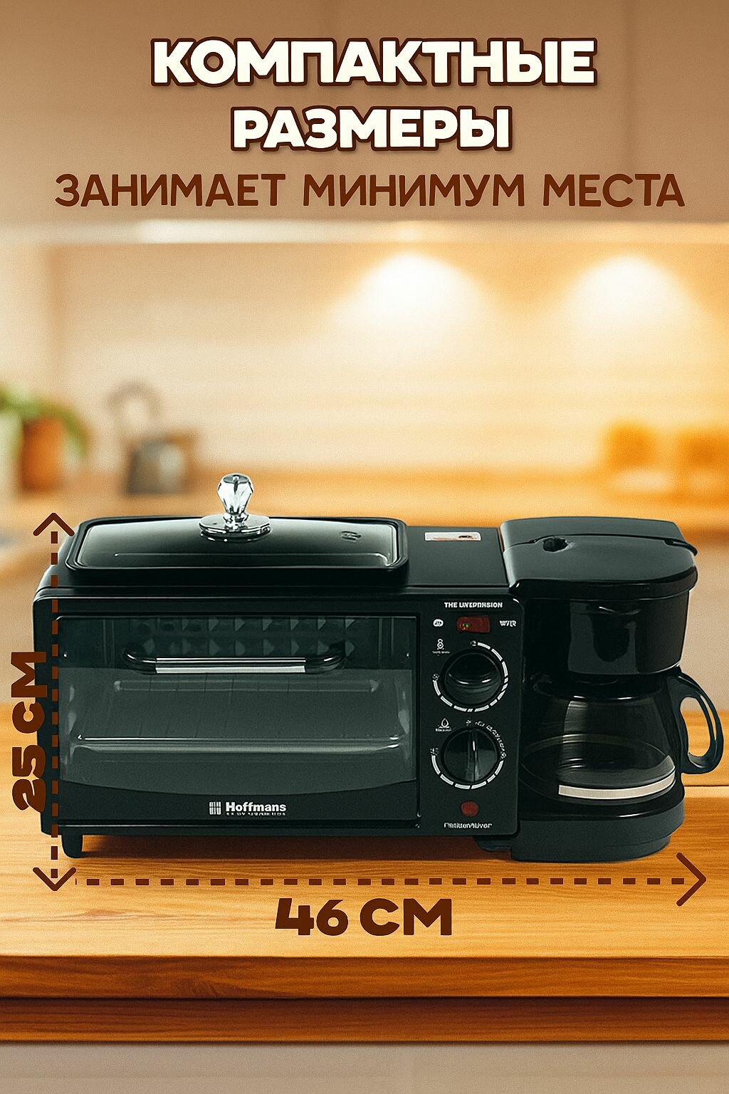 Купить Мини-печь Hoffmans 3в1, электрическая, механическое управление, 3 режима, черная с кофеваркой с доставкой по всей России.