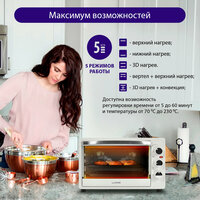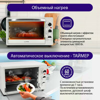 Общие характеристикиТипмини-печьРежимыверхний нагрев, нижний нагрев, верхний+нижний нагревМаксимальная температура нагрева230 °CМинимальная температура нагрева70 °CОсобенноститаймерУправлениемеханическоеМаксимальное время установки таймера60 мин. Комплектациядержатель для противня/решётки, вертел, противень, решётка, поддон для сбора крошекДизайнтрадиционныйДополнительная информациясигнал об окончании приготовления, дверца из закаленного стекла, световой индикатор работы; ручка для вертела в комплекте; количество противней в комплекте: 1Габариты и весВес7.9 кгТехнические характеристикиОбъём камеры33 лМаксимальная потребляемая мощность1800 Вт