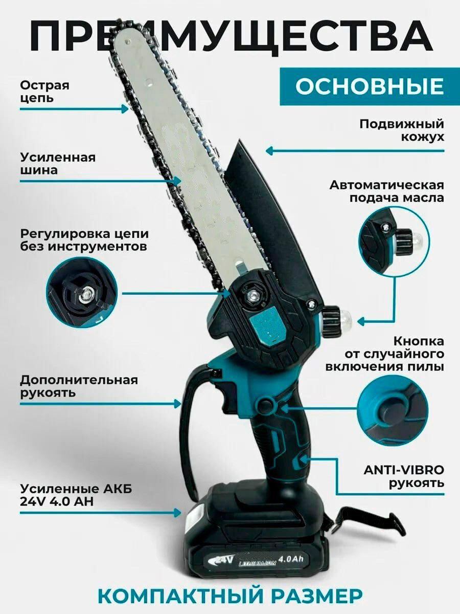 Мини-пила аккумуляторная, 24В, 6 дюймов, с маслоподачей, прорезиненная рукоятка, синяя