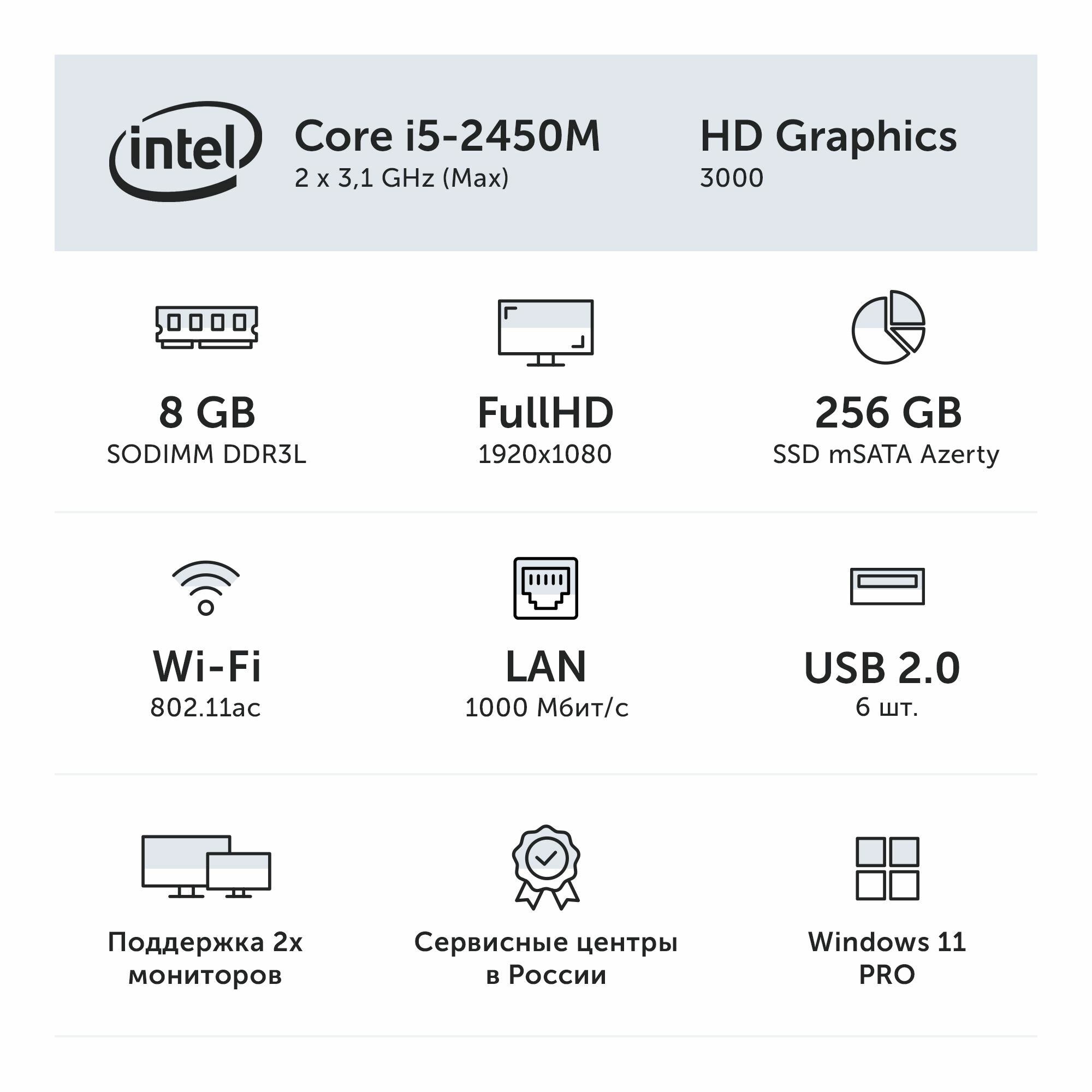 - Интегрированная видеокарта Intel HD Graphics 3000 обеспечивает плавное воспроизведение видео и работу с несложной графикой.