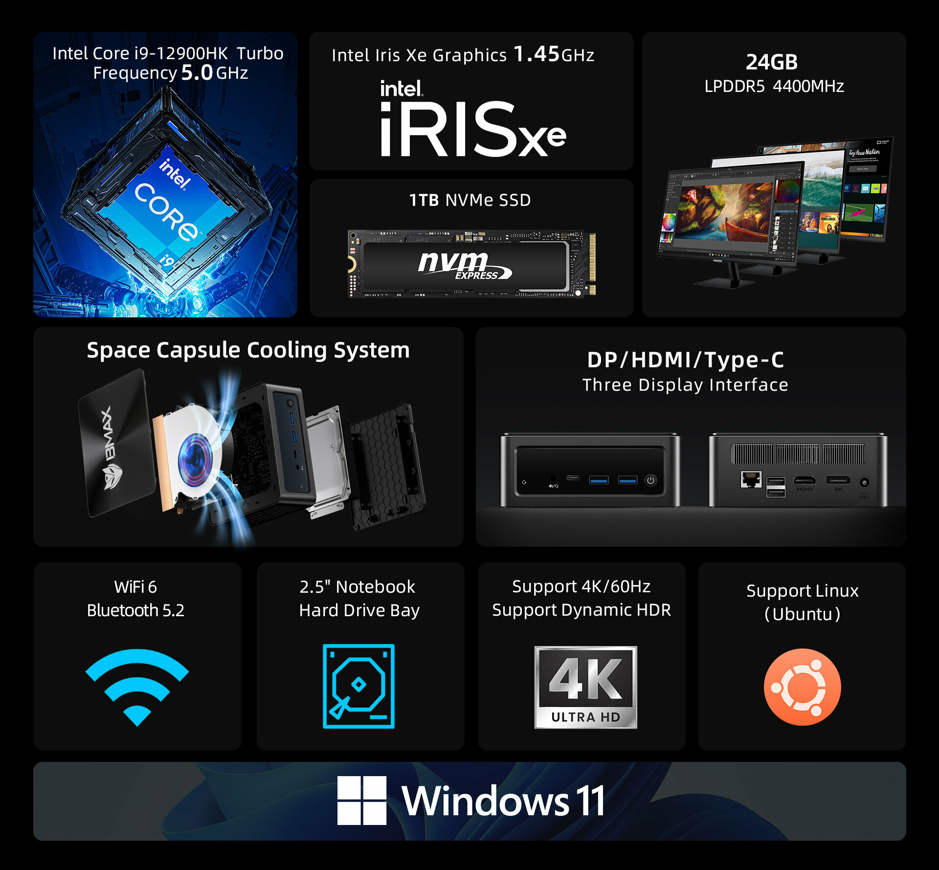 Мини ПК BMAX B9 POWER Intel® Core™ i9-12900HK 24G/1T SSD Windows 11