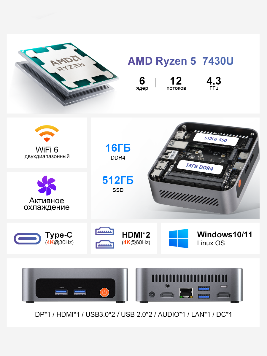 Мини-ПК Ninkear M7, AMD 7430U, 16ГБ RAM, SSD 512ГБ, черный,AMD Radeon™ Graphics: сравнение цен, характеристики, фото, актуальное наличие и цены.