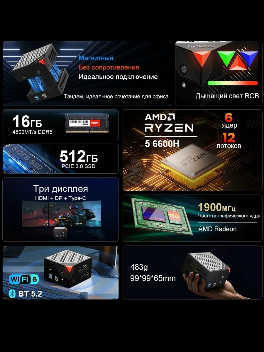 Купить Мини ПК NINKEAR MBOX 6, AMD R5 6600H, RAM 16ГБ, ROM 512 ГБ SSD, AMD Radeon Graphics, Windows 11 Pro, Type-c, черный с доставкой по всей России.