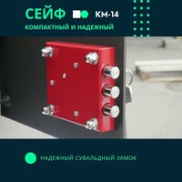 Ещё один плюс нашего металлического сейфа – его небольшой вес. Благодаря этому факту, вы сможете без труда менять его расположение: поставьте KM-14 в спальне, а через какое-то время перенесите его в гостиную, если там он будет нужнее. В любой момент вам удастся перевезти его на дачу или на работу. Если же вам он точно нужен только в одном месте, то в конструкции сейфа предусмотрены отверстия для анкерных болтов, которые идут в комплекте - с их помощью вы сможете закрепить сейф металлический к стене или к полке
