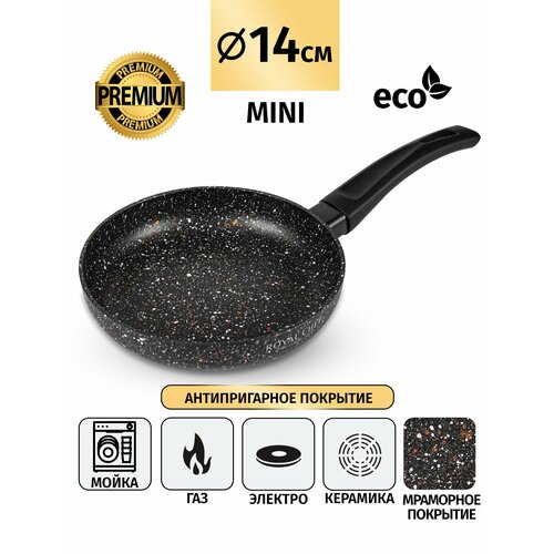 Мини сковорода от Royal chef. Универсальная сковорода станет незаменимым помощником на вашей кухни. Материал сковороды литой алюминий, внутреннее покрытие мраморное антипригарное. Специальное мраморное покрытие, не даст вашей еде пригореть и для приготовления не потребуется много масла. Также посуда с таким покрытием легко и быстро моется. Мини сковорода позволит быстро без затруднений приготовить индивидуальную порцию. Посуда предназначена для индукционной плиты, но из-за маленького диаметра некоторые плиты НЕ видят предмет.