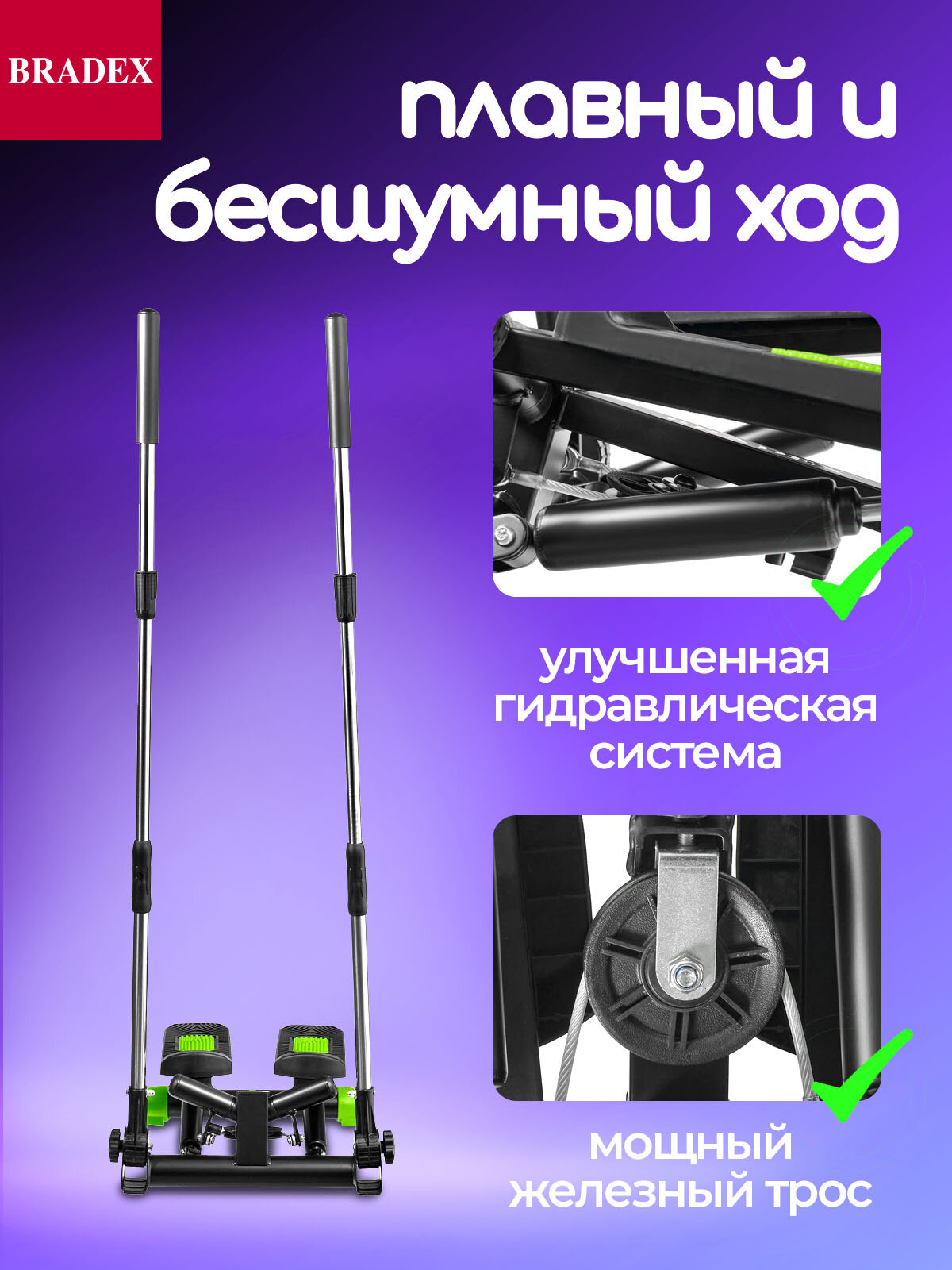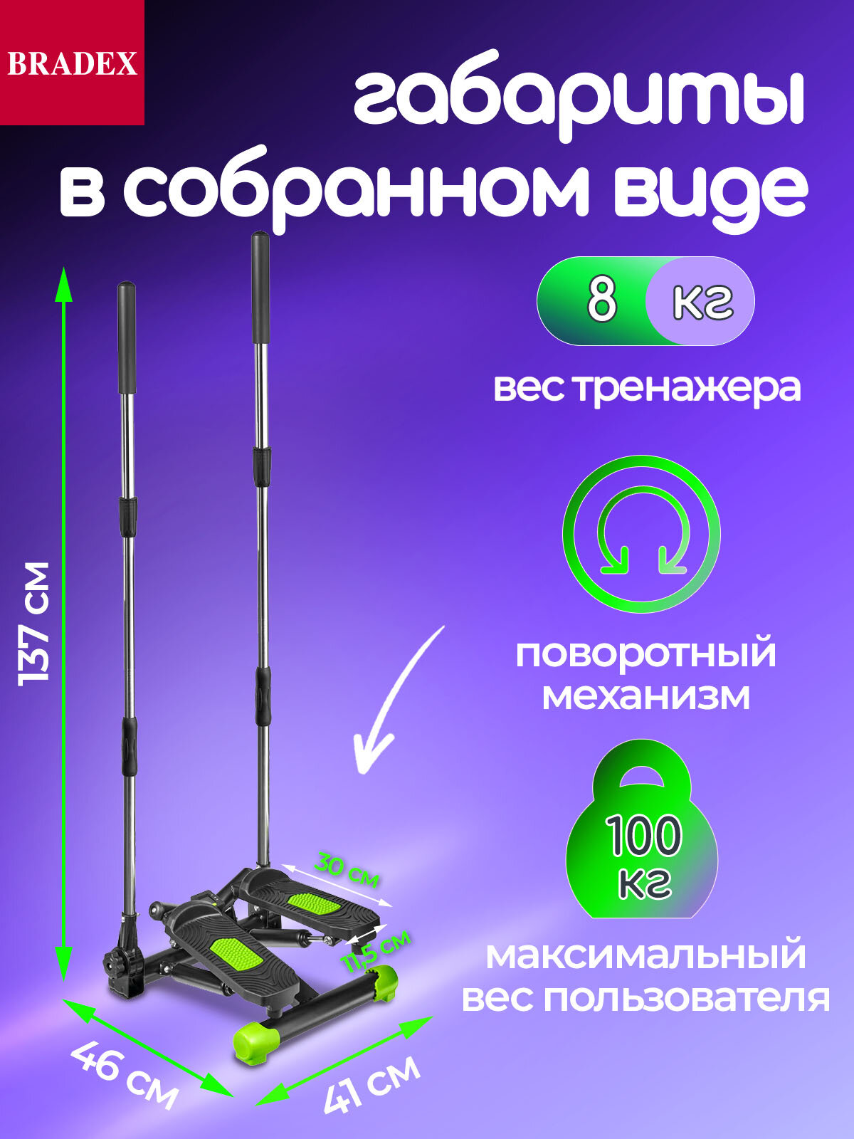 Степпер поворотный со складными поручнями, модель "Спринт" от бренда BRADEX. Многофункциональный педальный кардио тренажер, разработанный для аэробной тренировки, спорта и фитнеса, дома или в спортивном зале. Министеппер имитирует подъем по лестнице со ступени на ступень и отлично прорабатывает все группы мышц: ног, бедер, икр и ягодиц, а также задействует мышцы спины, талии, рук и пресса. Используется для похудения, интенсивного сжигания калорий, реабилитации и повышения здоровья. Упражнения на кардиотренажере укрепляют сердечно-сосудистую систему, улучшают микроциркуляцию крови, лимфодренаж и обмен веществ. Домашний мини степпер для ходьбы поможет сделать мышцы тела рельефными и сильными, справиться с лишним весом и гиподинамией. Избавиться от живота, боков и целлюлита, подтянуть и накачать попу. Спортинвентарь отличается оптимальным уровнем нагрузки до 15 кг, которую обеспечивают прочные гидравлические цилиндры. Стальная конструкция обладает высокой устойчивостью и выдерживает вес до 100 кг. Большие удобные педали имеют нескользящую поверхность, регулируются по высоте. Степ тренажер оснащен электронным дисплеем. На мониторе отражается вся необходимая информация: расход калорий, время тренировки, общее количество шагов, количество шагов в минуту. Складные поручни используются для дополнительной устойчивости и проработки рук, груди, предплечья. Компактный тренировочный инвентарь отличается эргономичным дизайном и хорошо вписывается в любой интерьер. Резиновые ножки защитят пол от царапин во время занятий.