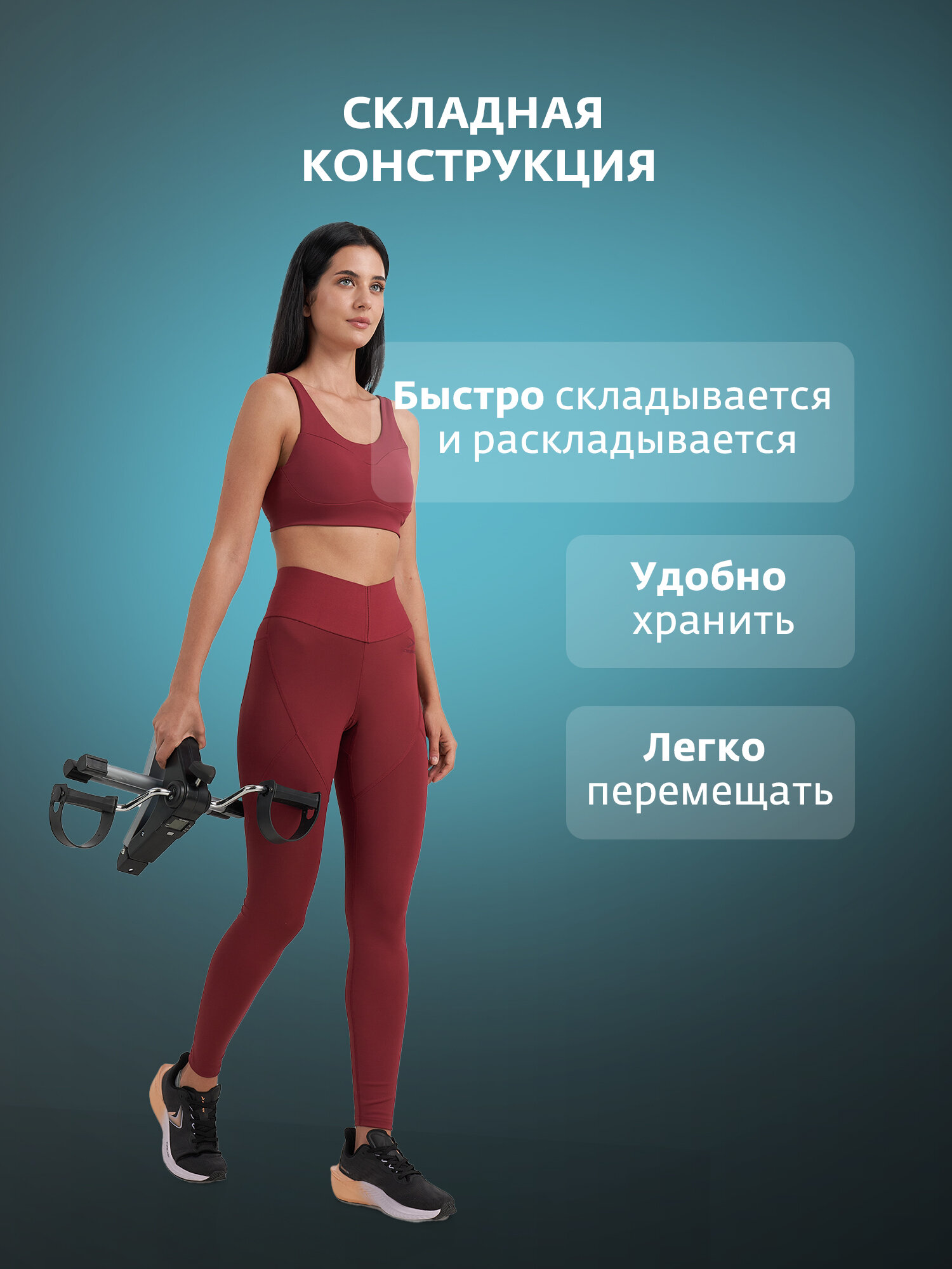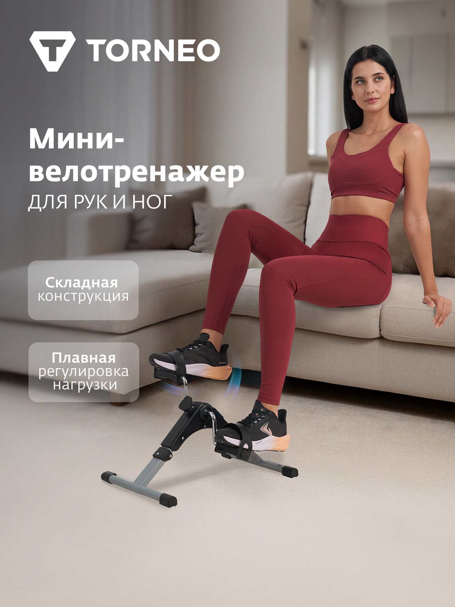 Складной мини-велотренажер Torneo — идеальный помощник для домашних тренировок. Он помогает прорабатывать мышцы ног, бедер, ягодиц и рук, способствуя улучшению тонуса и сжиганию калорий. Благодаря компактным размерам тренажер не займет много места в квартире. Его удобно брать с собой, например на дачу или в командировку, чтобы не пропускать занятия.