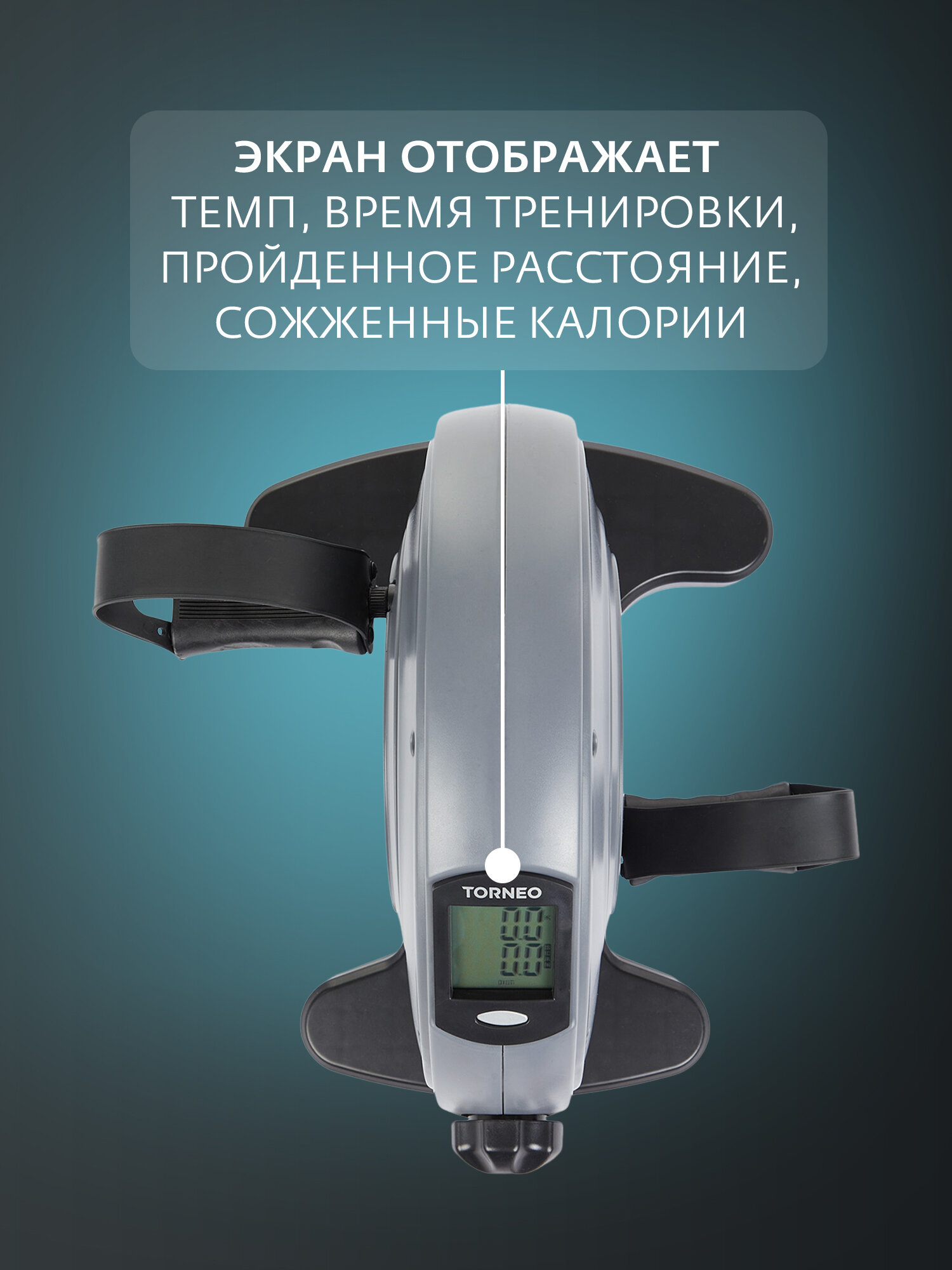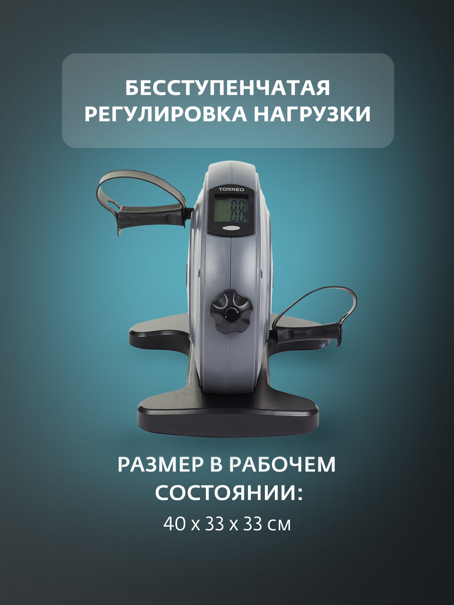 Компактный и функциональный мини-велотренажер Torneo станет идеальным выбором для людей старшего возраста и тех, кому необходимо бережно относиться к своим суставам. Велотренажер создан с использованием технологии EverProof и способен выдерживать нагрузку до 100 кг. Нагрузку можно подстраивать под себя с помощью удобной рукоятки. На LCD-дисплее вы сможете отслеживать основные параметры тренировки, такие как время, количество сжигаемых калорий, скорость, количество вращений в минуту и пройденная дистанция. Ремешки на педалях регулируются по длине, обеспечивая удобную посадку и комфорт во время занятий. Размеры тренажера 40x30x33 см, а его вес всего 6 кг, что позволяет легко перемещать его и хранить даже в небольших помещениях. Питание велотренажера осуществляется от батареек, что делает его еще более удобным и мобильным.