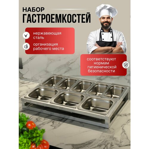Набор гастроемкостей из нержавеющей стали с увеличенной прочностью и долговечностью поможет вам удобно и красиво организовать рабочее место повара.