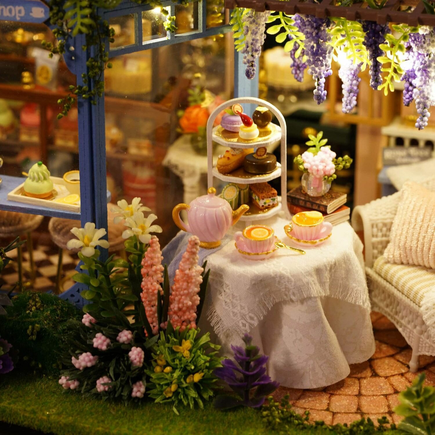 Комплектация: пылезащитный купол (оргстекло), подсветка (провода, выключатель, светодиодные лампы); деревянные основания для каркаса (стены, пол); бумага, текстиль, проволока и т. д. (для создания всех элементов декора); элементы интерьера в миниатюре; клей 2 шт, инструкция