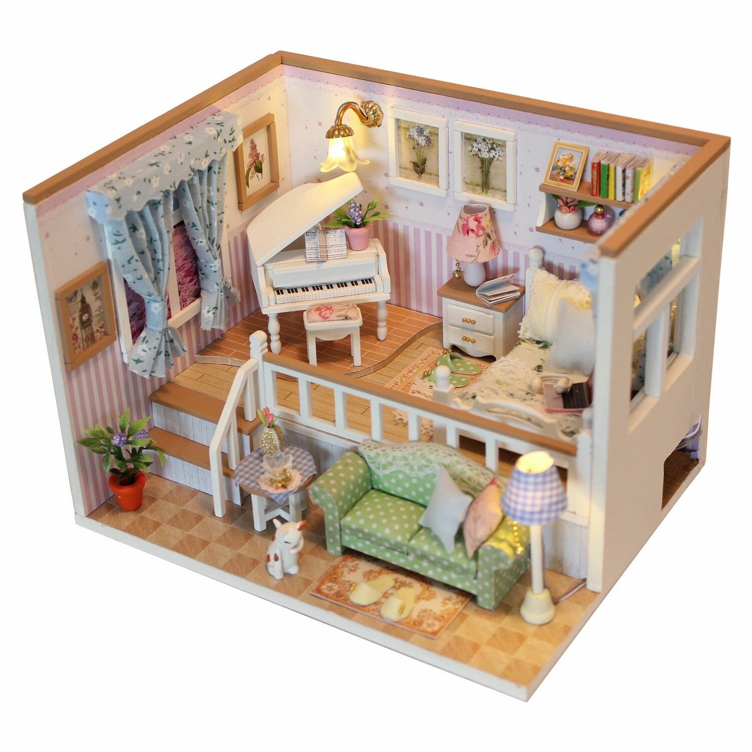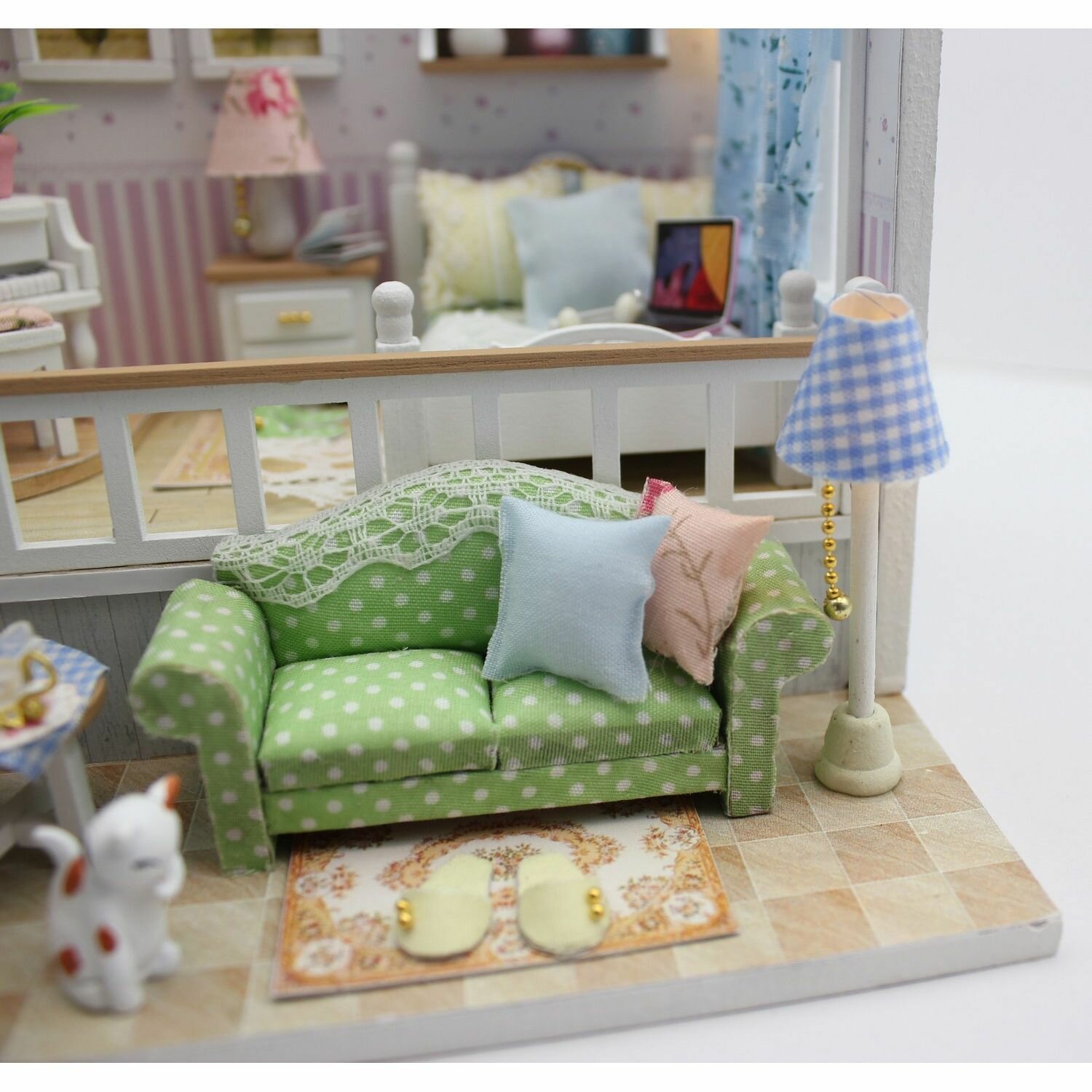 Комплектация: пылезащитный купол (оргстекло), подсветка (провода, выключатель, светодиодная лампа); деревянные основания для каркаса (стены, пол); бумага, текстиль, проволока и т. д. (для создания всех элементов декора); элементы интерьера в миниатюре; инструменты для сборки (клей 2 шт, пинцет, линейка), инструкция