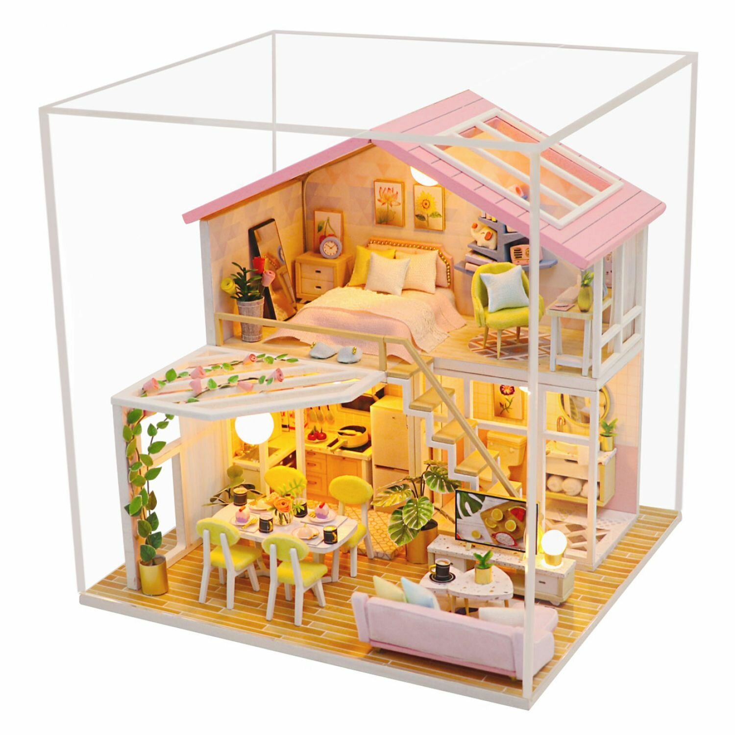 Комплектация: пылезащитный купол (оргстекло), подсветка (провода, выключатель, светодиодная лампа); деревянные основания для каркаса (стены, пол); бумага, текстиль, проволока и т. д. (для создания всех элементов декора); элементы интерьера в миниатюре; инструменты для сборки (клей 2 шт, пинцет, линейка), инструкция