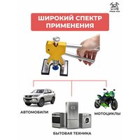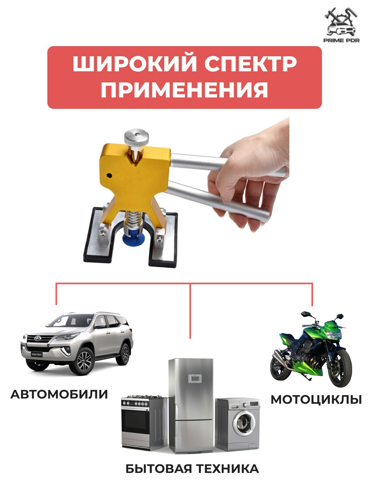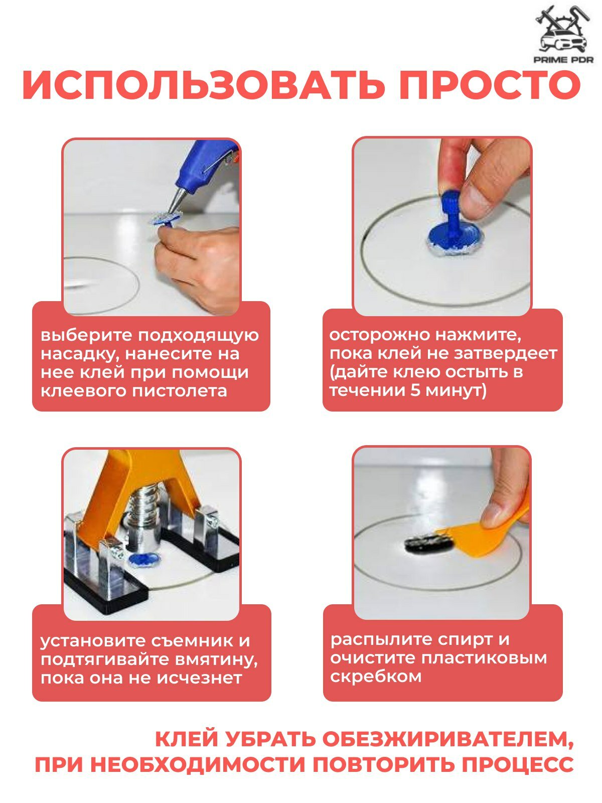 Способ применения: грибок приклеивается горячим клеем к вмятине по центру и выдерживается от 1 до 5 минут, после чего вытягивается лифтером. Сила тяги регулируется вручную с помощью верхних винтов. Клеевой пистолет для выпрямления вмятин приобретается отдельно.