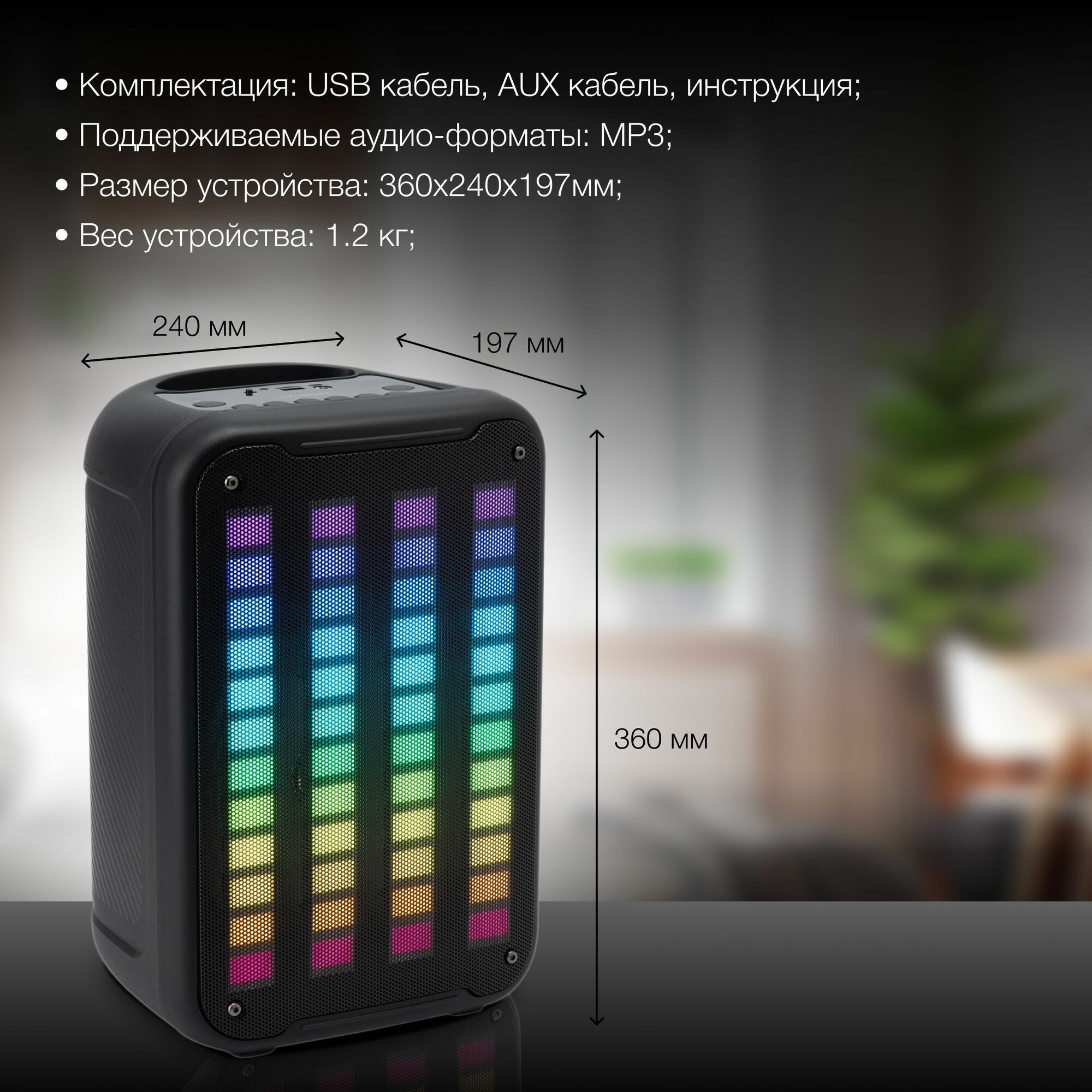 Частотный диапазон центр. АС - 20 Гц - 20 кГц; Мощность центрального канала - 25 Вт; Суммарная звуковая мощность - 25 Вт; Количество полос центрального канала - 1 шт.; Интерфейсов USB 2.0 Type A - 1 шт.; Воспроизведение медиафайлов с устройства Apple; Подсветка