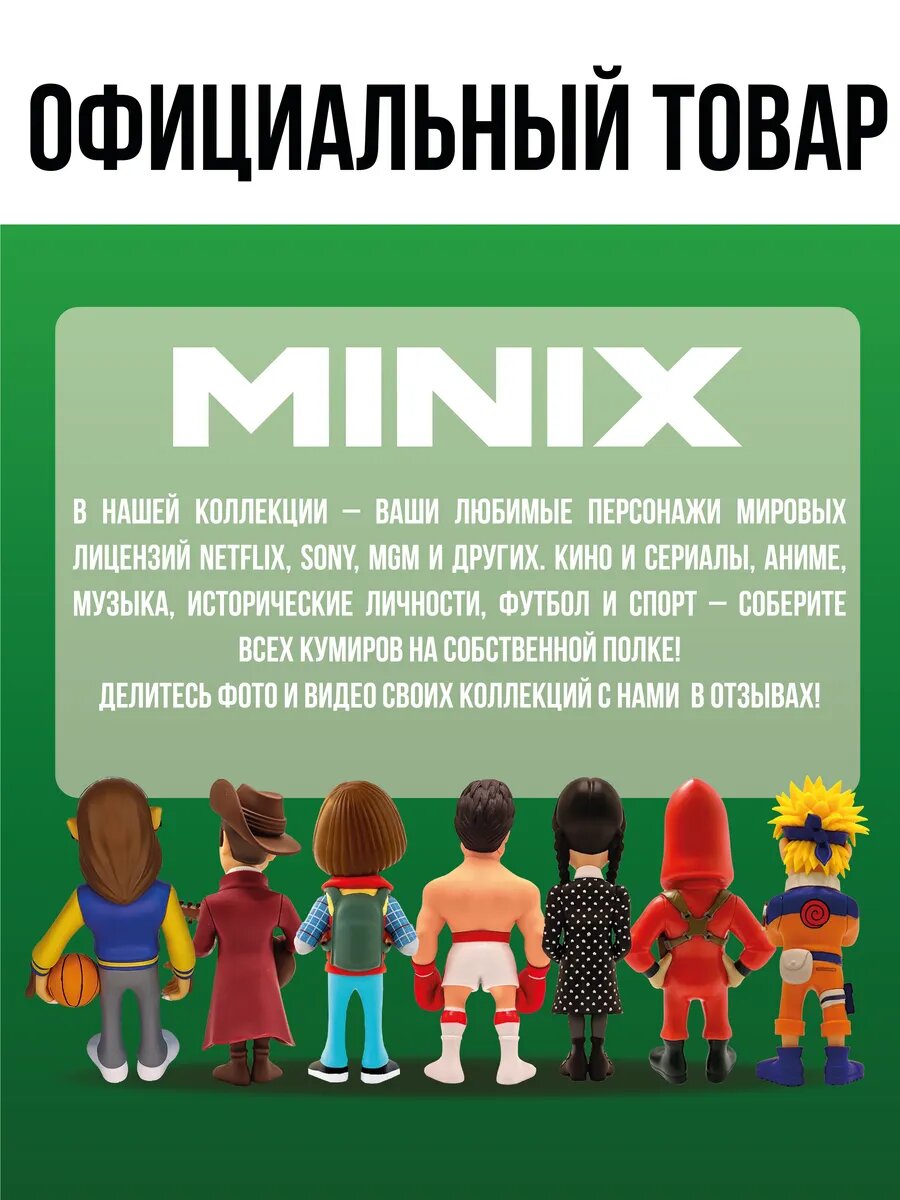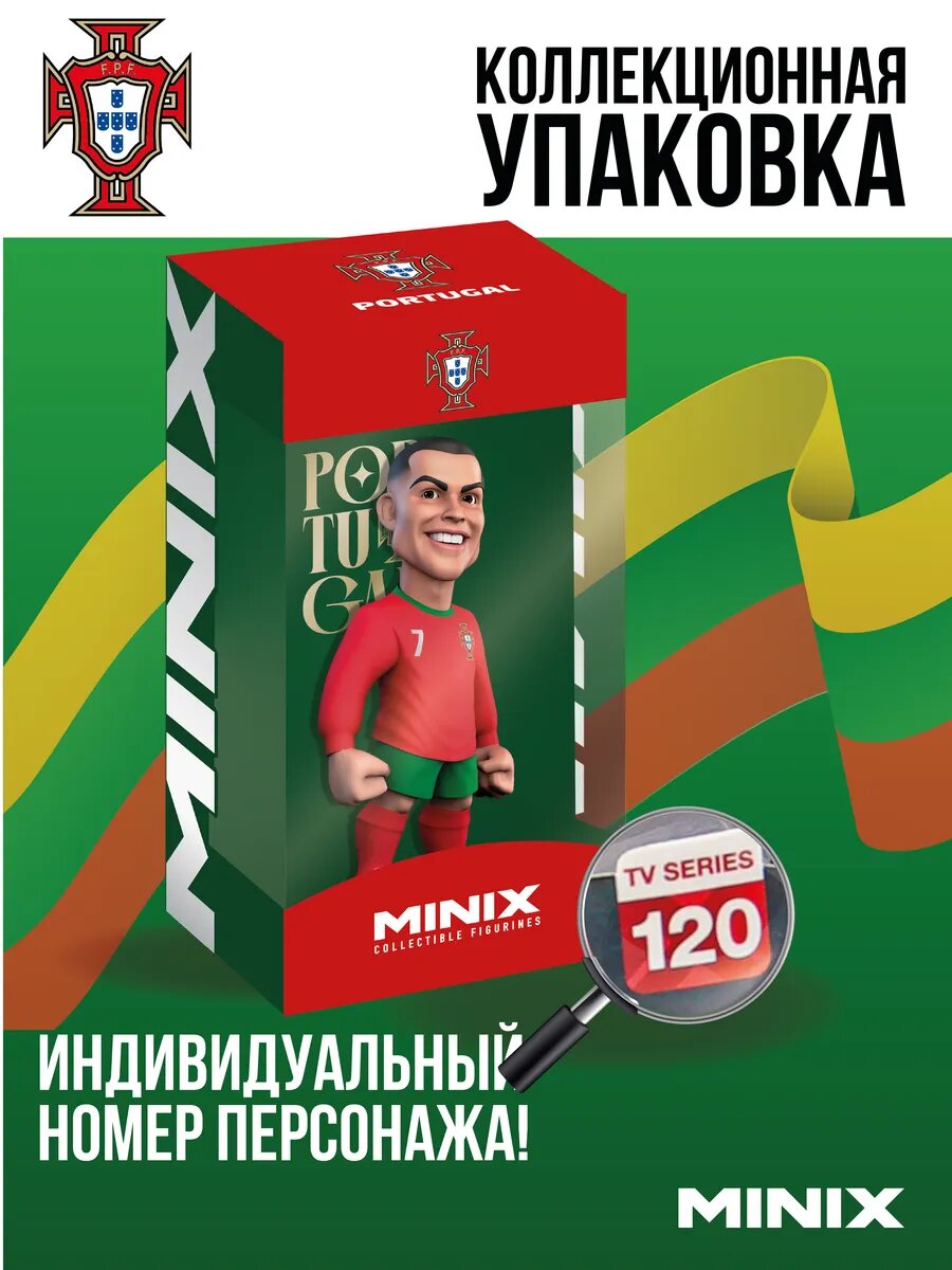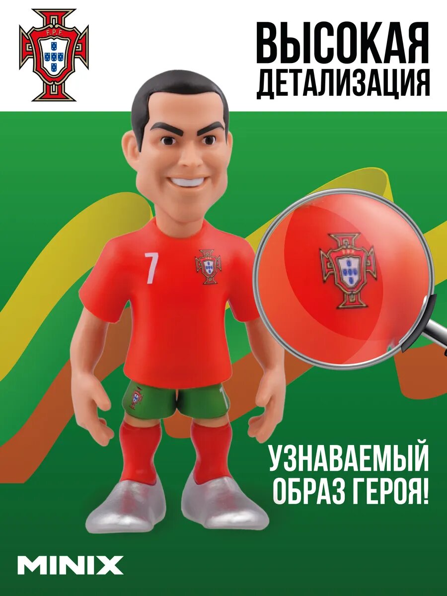 Описание фигурки Minix Футболисты: Криштиану Роналду - Сборная Португалии (12 см) (18031): Представляем вашему вниманию фигурку Minix Футболисты: Криштиану Роналду - Сборная Португалии (12 см) (18031), созданную в виде футбольного игрока Криштиану Роналду. Криштиану Роналду - это икона мирового футбола, олицетворяющая совершенство, преданность и стремление к успеху. В составе "Сборной Португалии" и в клубе он зарекомендовал себя как один из величайших игроков всех времен, часто сравниваясь с другими выдающимися футбольными звездами. Его физическая форма, скорость и технические навыки позволяют ему быть ключевым игроком на любом уровне игры. Криштиану не только показывает выдающиеся результаты на поле, но и активно участвует в благотворительной деятельности, служа для молодежи примером лидерства и ответственности. Его история - это пример того, как труд и жертвы ведут к огромному успеху, вдохновляя людей достигать своих целей и мечтаний. Роналду не просто футболист, он - символ стремления к совершенству и целеустремленности. Minix - это бренд лицензионных коллекционных фигурок! Идеальный вариант для преданных фанатов, начинающих и опытных коллекционеров и всех, кто следит за поп-культурой! Широкий выбор лицензий и героев. В тематических линейках вас ждут фигурки на любой интерес: кино и сериалы, аниме, музыка и другое. Среди брендов Minix: Naruto, Wednesday, Breaking bad, The Witcher, Squid game и другие. Высота каждой фигурки - 12 см. Компактная игрушка! Фигурки Minix отличает высокая детализация, внимание к стилю каждого героя, прочность и качество материалов, а также уникальная дизайнерская упаковка в стиле вселенной персонажа. На коробке вы найдете индивидуальный номер каждого героя для истинных охотников за оригинальными экземплярами. Размер упаковки: 9х19х8 см. Вы можете поставить героя Minix на полку как в коробке, так и без нее. Фигурки унисекс: подходят для мальчиков и девочек. Универсальный подарок: порадуют не только детей и подростков, но и взрослых. Для детей старше 3-х лет. Найдите своего кумира в коллекции Minix! Характеристики фигурки Minix Футболисты: Криштиану Роналду - Сборная Португалии (12 см) (18031): Упаковка: картонный бокс Материал: пластик Высота: 12 см