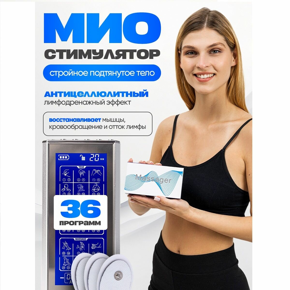 Миостимулятор 3в1 Импульсный 36 программ, антицеллюлитный вибромассажер для тела, шеи, плеч, спины, ног, живота, электрический тренажер для похудения