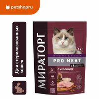 После стерилизации у кошек и кастрации у котов изменяется гормональный фон, что влияет на весь организм и способствует снижению активности и появлению избыточной массы тела у питомцев. Специальный корм PRO MEAT — источник легкоусвояемого белка со свежим мясом кролика и полезных натуральных ингредиентов. Рыбий жир и семена льна придадут блеск шерсти, а минеральный комплекс из кальция, фосфора и магния снизит риск возникновения мочекаменной болезни. Добавление L-карнитина, участвующего в жировом обмене, поможет питомцу сохранять прекрасную физическую форму.