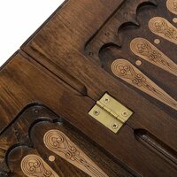 Для создания этого экземпляра берется цельный массив дерева бук. Выбор материала был сделан не случайно, ведь работать с ним - одно удовольствие. Благодаря легкости обработки, удается придать поверхностям изысканный внешний вид, подчеркнутый узорами и оформлением. Также бук достаточно прочен, чтобы выдерживать ожесточенные партии, удары фишками о поверхность, и даже падения с небольшой высоты. Примечателен он и своей долговечностью - при правильном уходе, доска прослужит более десятка лет, а может и больше. Ухаживать за ней легко, достаточно смахивать пыль и очищать от следов жирных пальцев, а при долгом хранении пользоваться комплектным чехлом. Он сделан из мягкой ткани, которая не позволит грязи и пыли налипать на поверхности. Вдобавок стоит его использовать при транспортировке, что позволит смягчить тряску в автомобиле и обезопасит от появления микротрещин.