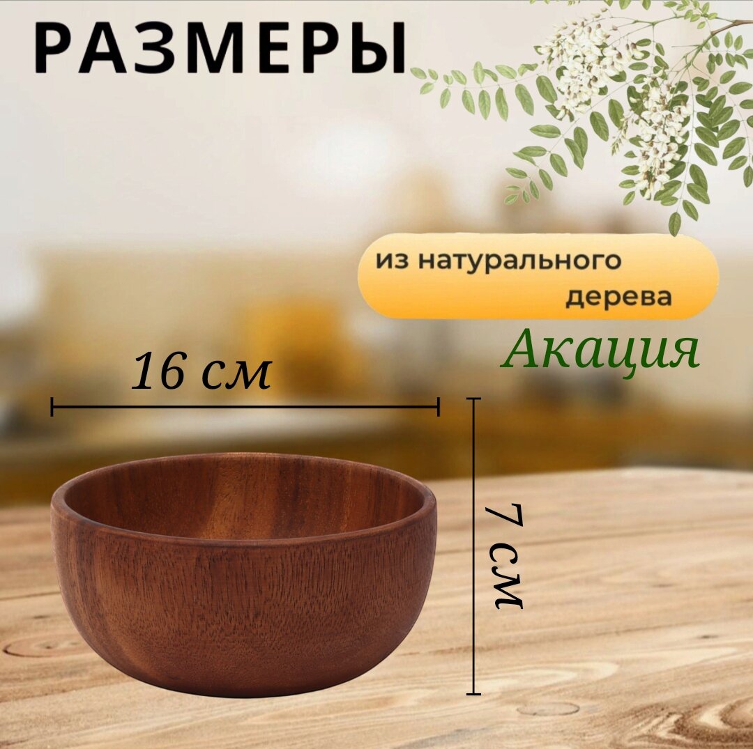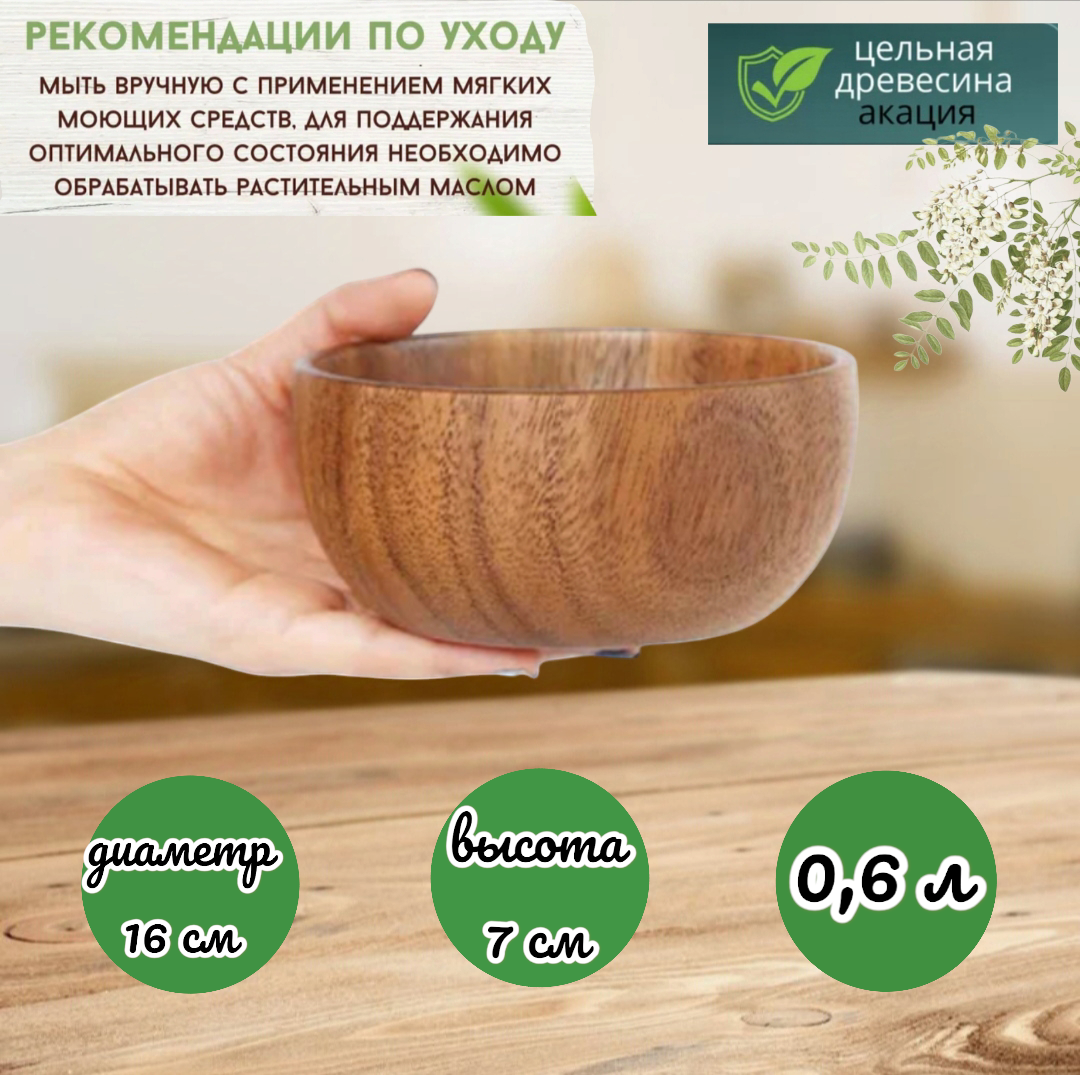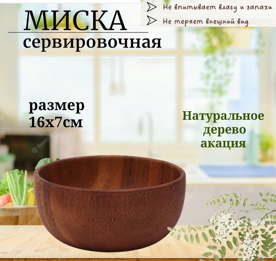 Миска изготовлена с использованием цельного массива акации без клея. Это придает ей прочность и износостойкость. Она не трескается, не рассыхается, не подвержена гниению и плесени. Готовьте фруктовые и овощные салаты, например, цезаря, и закуски. Мисочка не впитывает запахи и влагу, это улучшает вкус и аромат приготовленных блюд. Используйте как емкость для воды, или другой жидкости.