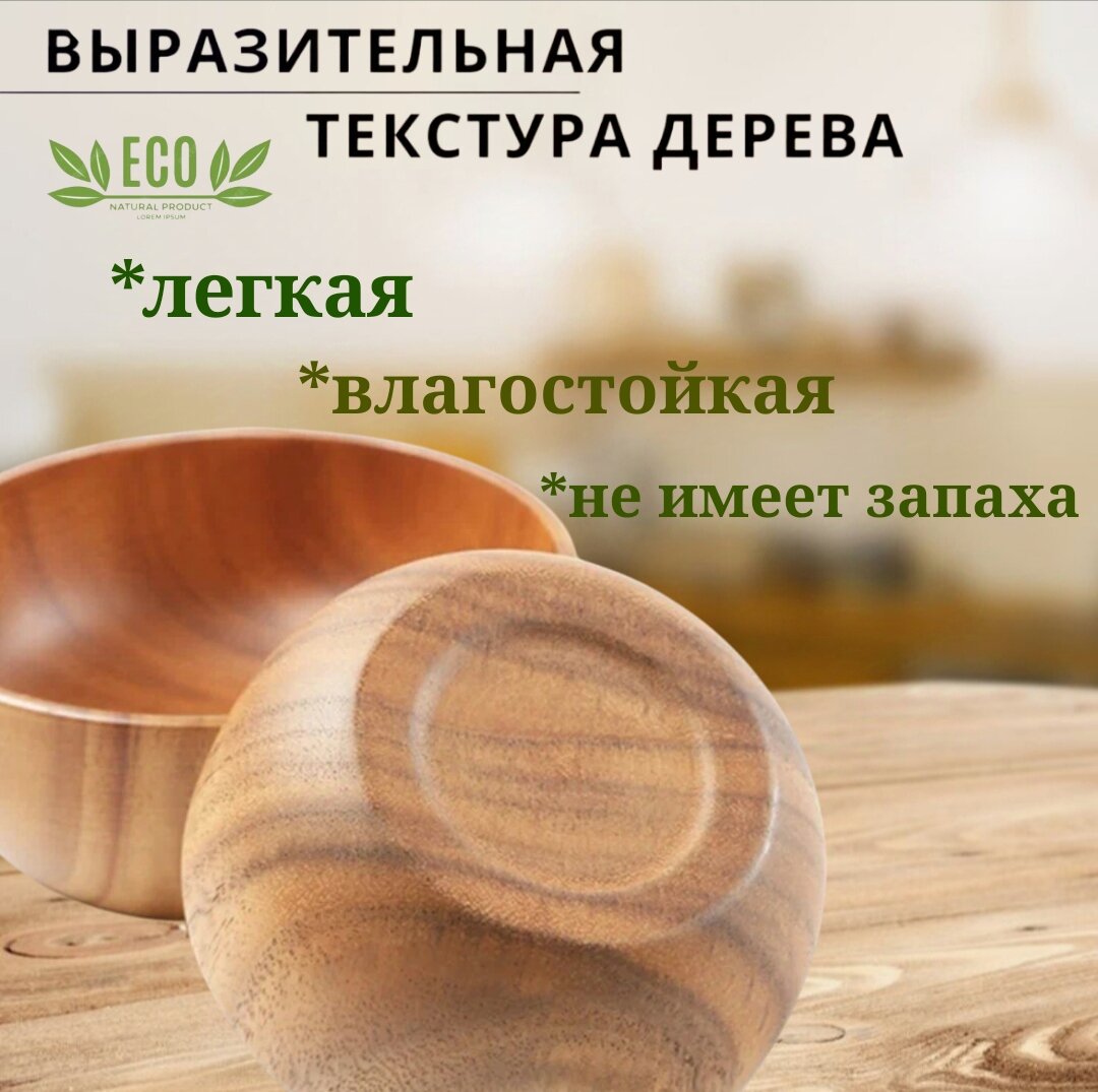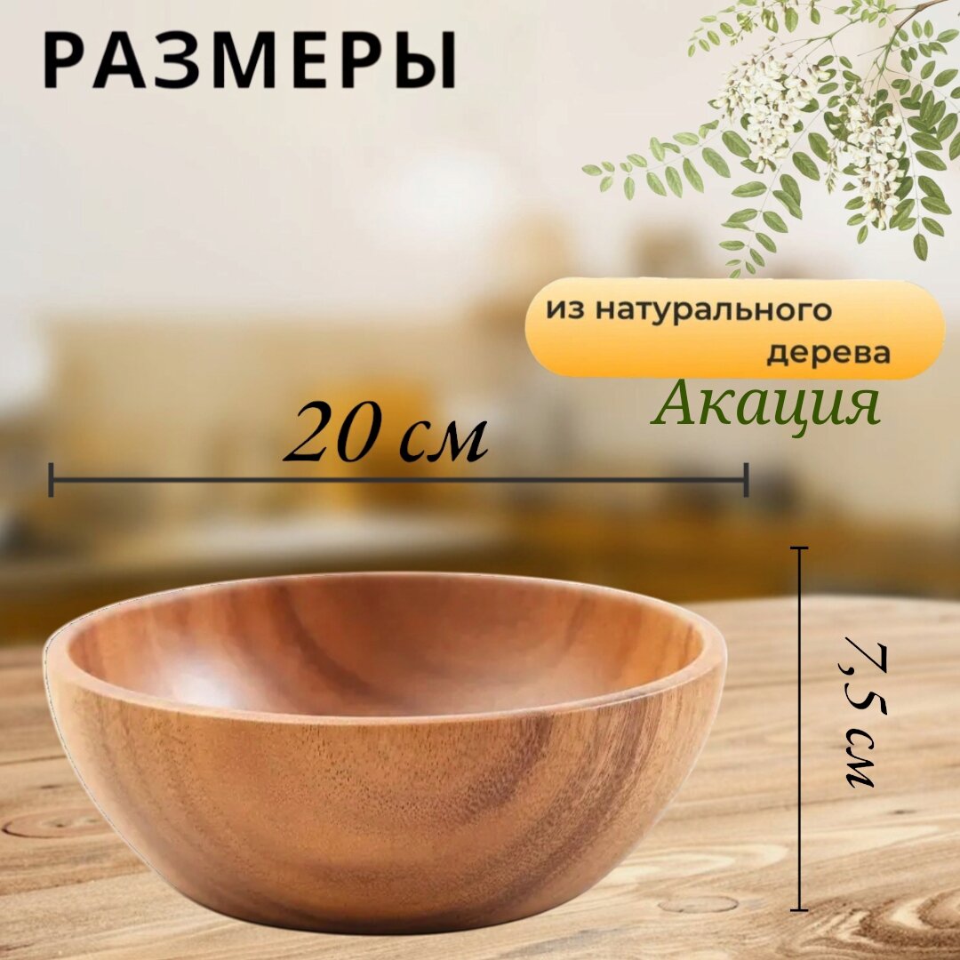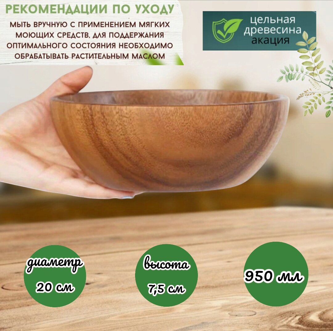 Миска изготовлена с использованием цельного массива акации без клея. Это придает ей прочность и износостойкость. Она не трескается, не рассыхается, не подвержена гниению и плесени. Готовьте фруктовые и овощные салаты, например, цезаря, и закуски. Мисочка не впитывает запахи и влагу, это улучшает вкус и аромат приготовленных блюд. Используйте как емкость для воды, или другой жидкости.