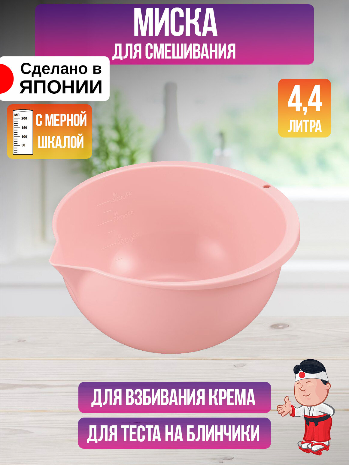 ТМ ENTEC представляет Вашему вниманию глубокую миску объемом 4,4 литра. Модель произведена и экспортирована из Японии, выполнена из пищевого пластика - полипропилена, данный вид материала обладает лёгкостью, прочностью и термостойкостью с режимом эксплуатации в пределах от -20 до +120 градусов Цельсия. Эти характеристики позволяет использовать миску с горячими продуктами во время приготовления еды, а также разогревать содержимое в микроволновой печи, не беспокоясь о повреждениях или деформации. Благодаря своему объему, емкость предоставляет большое пространство для смешивания ингредиентов, приготовления теста, салатов, маринования мяса и других кулинарных нужд. Корпус модели имеет широкий бортик, который можно использовать как ручки для легкого переноса, также емкость оснащена носиком для аккуратного переливания содержимого. На бортике нанесена мерная шкала с шагом в 500 мл, общий измеряемый объем составляет 3 литра. Широкий выбор товаров ТМ ENTEC позволит создать универсальные и практичные решения для Вашего дома.