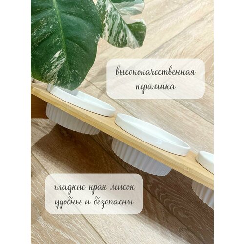 Керамическая посуда выполнена в современном дизайне. Миска станет отличным выбором для кормления ваших питомцев. Изделие состоит из трех чашек, что позволяет удобно разделять сухой и влажный корм. Тарелки подходят как для мелких пород, так и для более крупных животных. Деревянная стойка обеспечивает стабильность и предотвращает случайные перевороты. Антискользящие амортизаторы гарантируют надежное размещение на любой поверхности. Чаши легко чистятся. Можно мыть в посудомоечной машине, что экономит ваше время и усилия. Комплект подходит для щенков, котят и взрослых животных всех пород. Замечательный аксессуар для кухни, который дополнит интерьер вашего дома. Удобство использования оценят все владельцы домашних питомцев, ведь такое устройство устраняет беспорядок во время кормления. Подходит не только для питания, но также может быть использовано как питьевая посуда. Это особенно важно для поддержания здоровья вашего питомца. Работая над пищеварением своего четвероногого друга, выбирайте правильные продукты. Керамика обладает высокой прочностью. Она обеспечивает долговечность изделия при регулярном использовании. Набор удовлетворит потребности даже самых привередливых животных. Дополнительно стоит отметить легкость ухода за изделием. Высококачественные материалы делают его безопасным для здоровья питомца. Надежное крепление предотвратит перемещение по кухне вовремя приема пищи. Ваши любимцы смогут спокойно наслаждаться своим временем за едой без лишних помех.