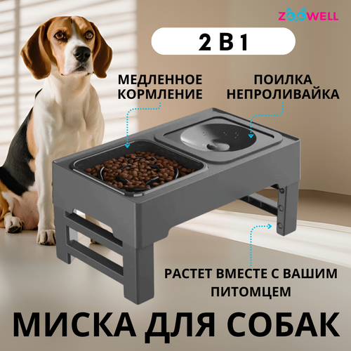 Купить Миска двойная для медленного кормления животных ZooWell Home цвет серый, регулируемая высота с доставкой по всей России.