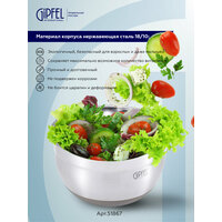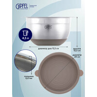 Незаменимая в хозяйстве металлическая миска Gipfel Federica 51867. Диаметр посуды составляет 24 см, высота равна 13,5 см. Объем 4,5 л.