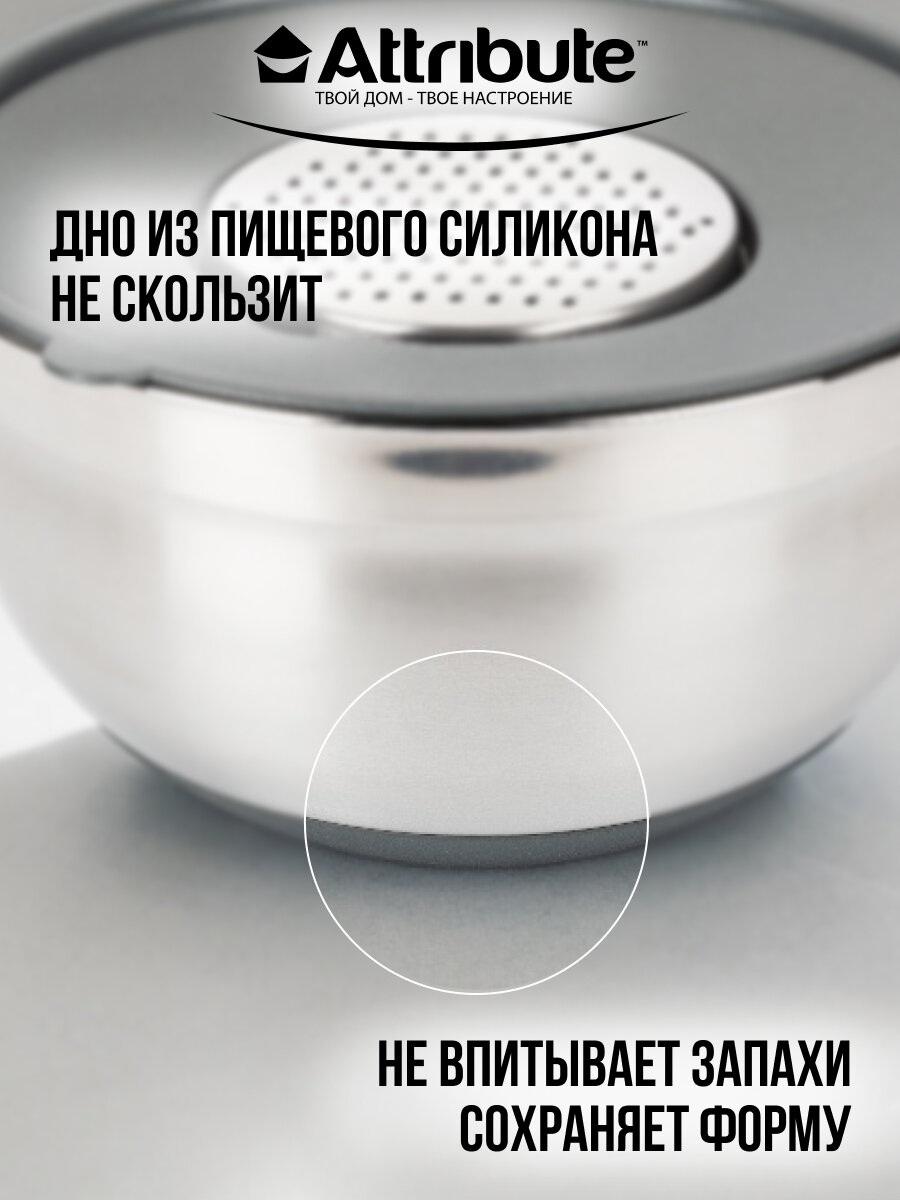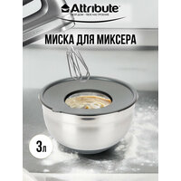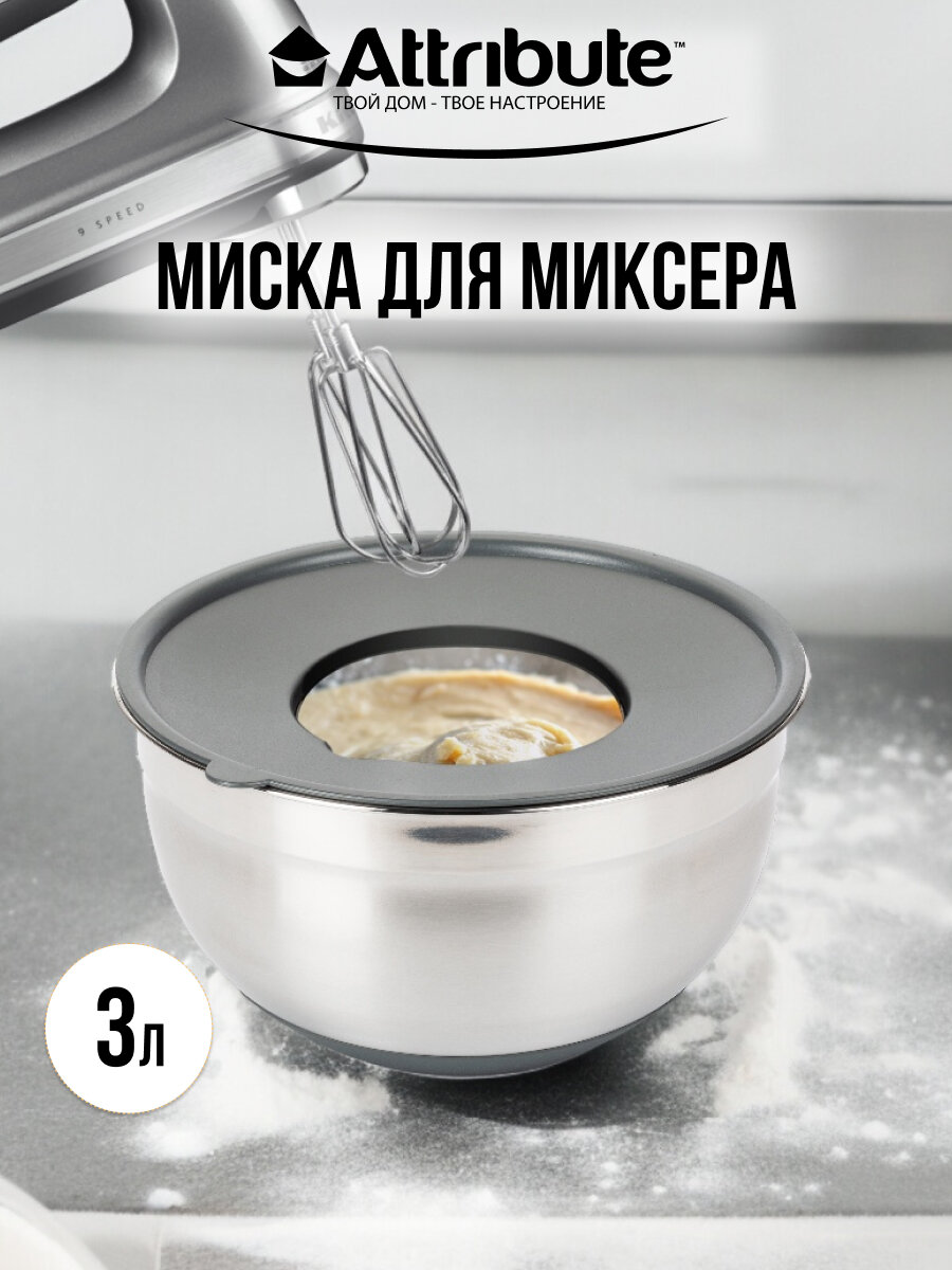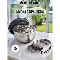 При взбивании крышка не даст брызгам разлететься во все стороны. Три причины подружиться с универсальной миской: 1. Материал миски и терок нержавеющая сталь, крышка выполнена из пластика. 2. На дне миски силикон, что обеспечивает устойчивость миски на поверхности. 3. Мерная шкала с внутренней стороны миски. Характеристики универсальной миски: Материал: сталь, пластик и силикон Размер: 24х 24 см, 3 л Благодаря миске с терками можно приготовить прекрасный ужин, смешать легкий салат, взбить тесто или замариновать шашлык. А крышка прикроет пищу находящуюся в ёмкости. В больших мисках крышки имеют отверстие, что помогает не испачкать все вокруг, во время взбивания ингредиентов. А также, для использования терок, входящих в комплект.