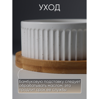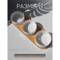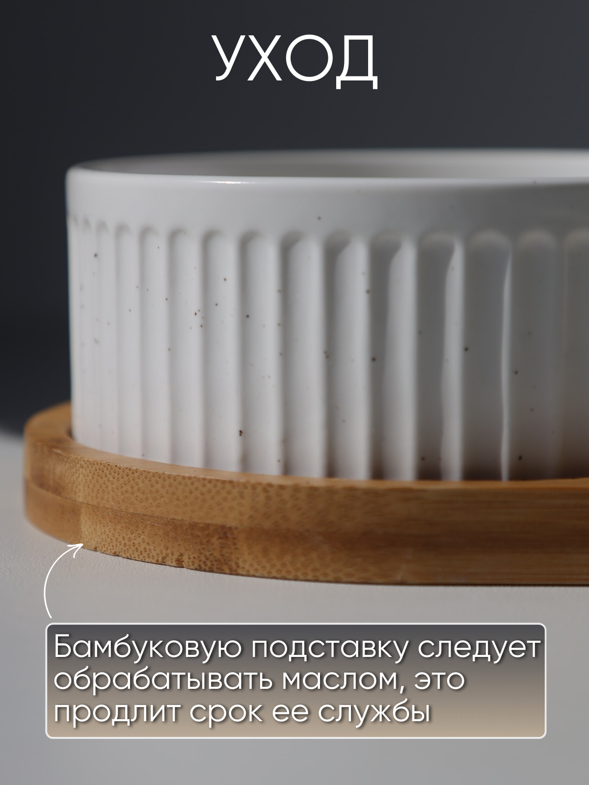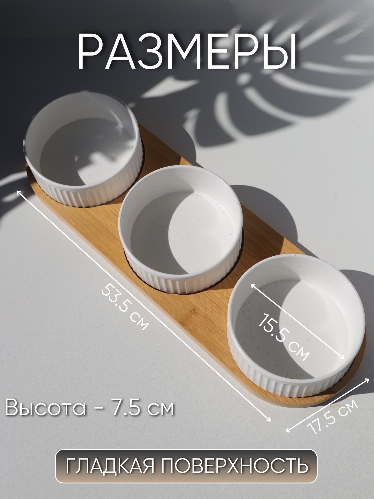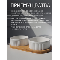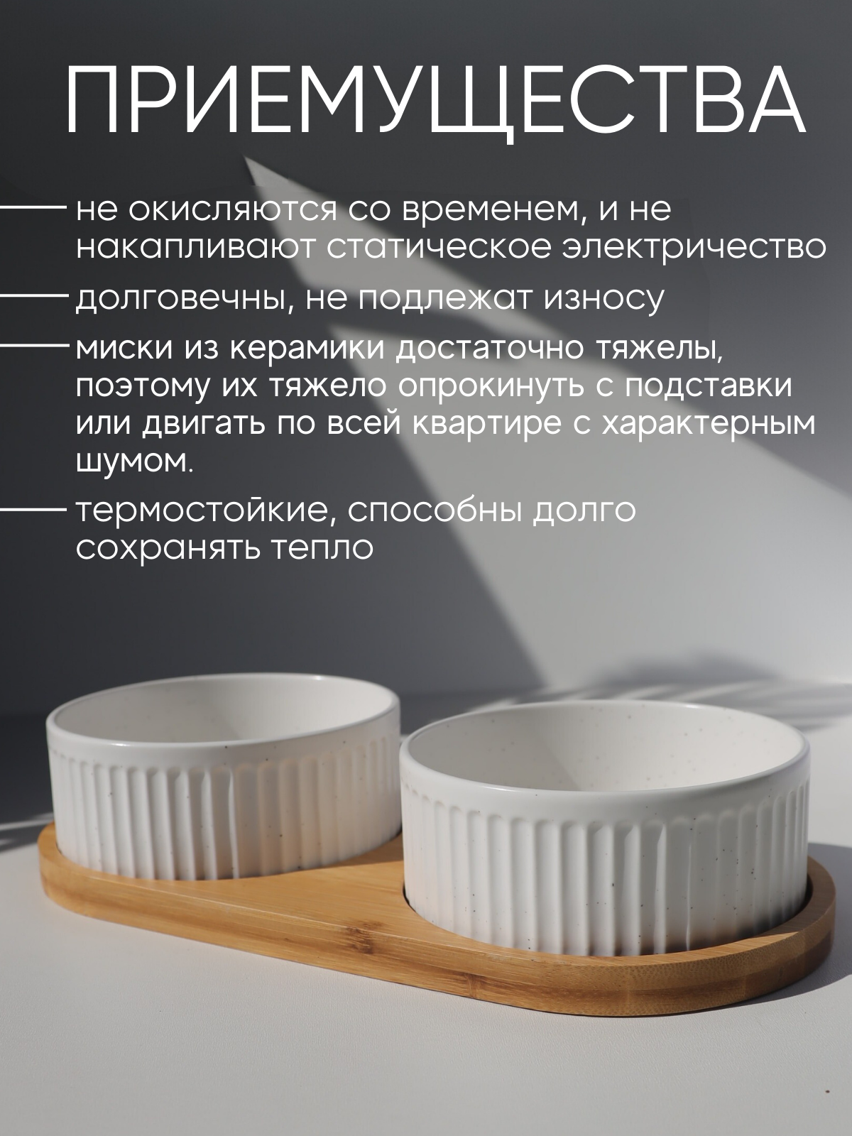 Особенностью мисок является их двойная конструкция. Между чашами расстояние, комфортное для приема пищи животными, корм с соседней чаши не будет падать в другую. Миски керамические двойные стоят на платформе из бамбука, что делает их устойчивыми, бесшумными и не двигающимися с места.