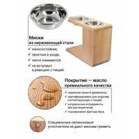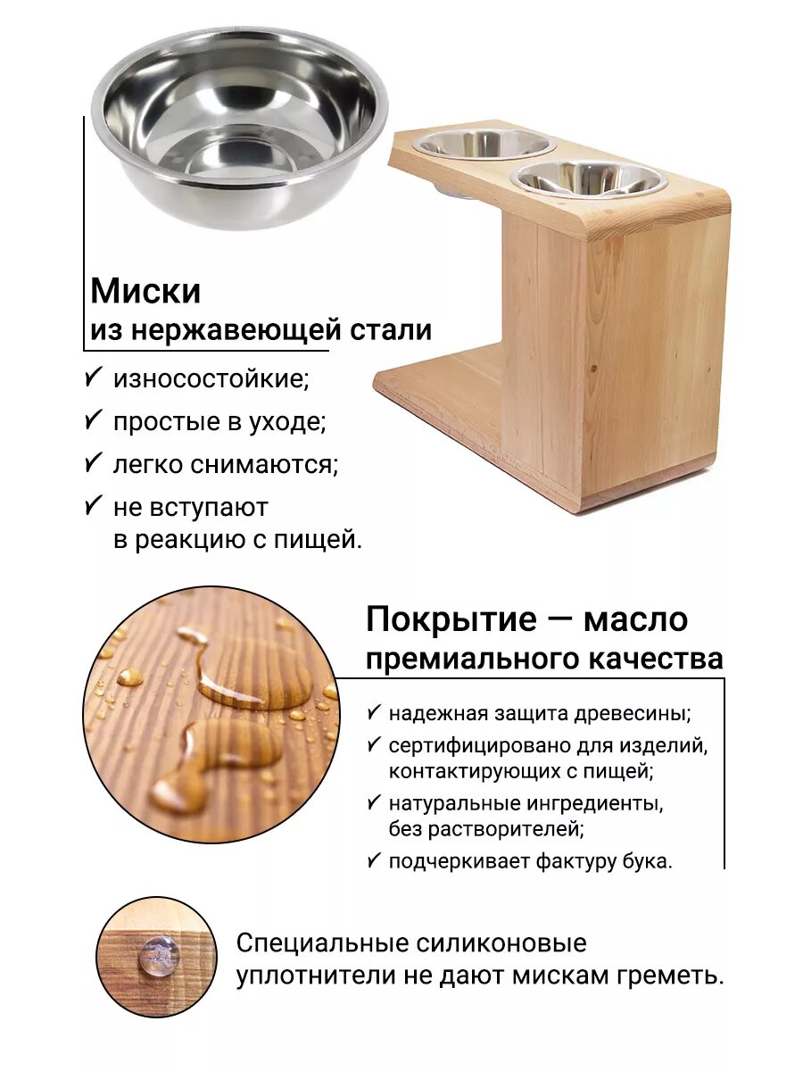 Покрыта маслом премиального качества, которое предназначено для контакта с пищей. Поэтому оно абсолютно безопасно для Вашего питомца. Масло пропитывает верхний слой дерева, создавая защиту от влаги и подчеркивая его естественную фактуру.