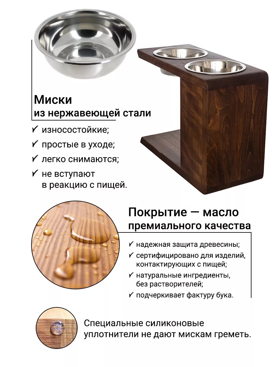 Покрыта маслом премиального качества, которое предназначено для контакта с пищей. Поэтому оно абсолютно безопасно для Вашего питомца. Масло пропитывает верхний слой дерева, создавая защиту от влаги и подчеркивая его естественную фактуру.