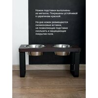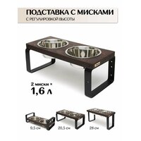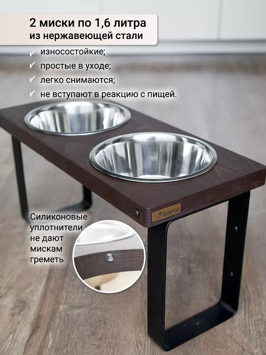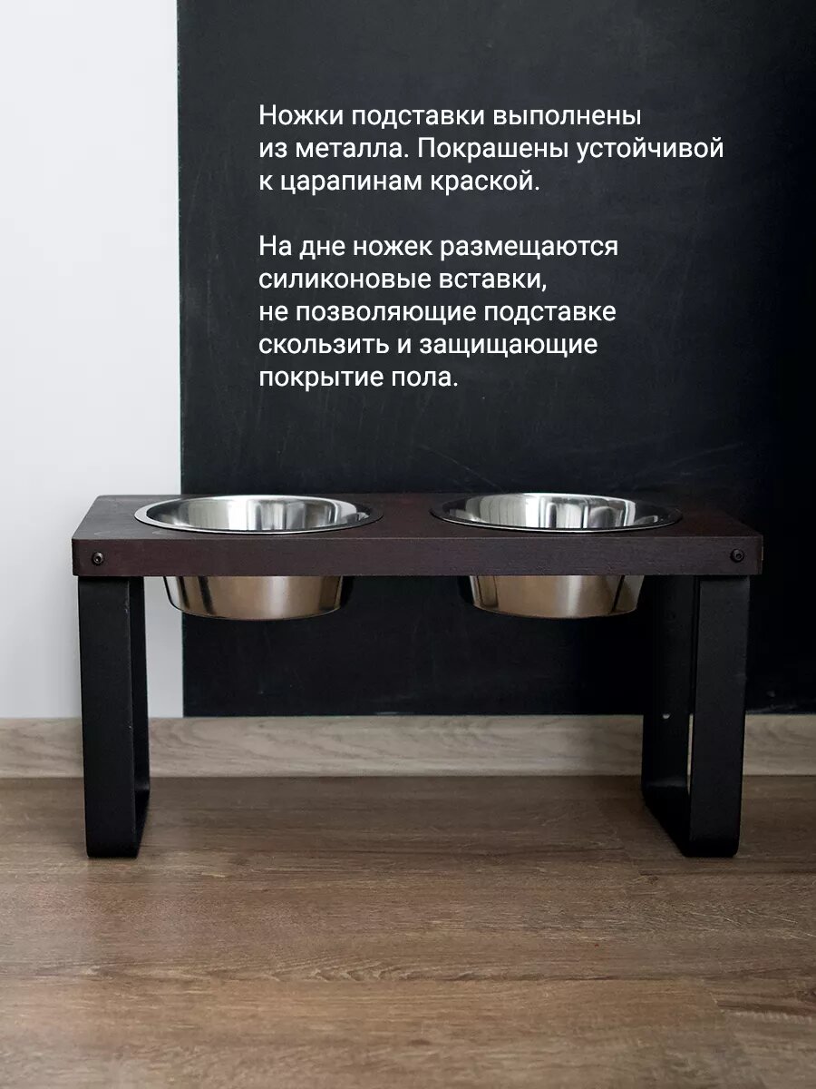 Подставка переменной высоты с мисками для собак Loft легко трансформируется, позволяя изменять её высоту. Несколько уровней, на которых можно разместить миски для собаки – 9,5 см, 20,5 см и 28 см от пола до верхней части столешницы. Также есть альтернативное положение высотой 12,5 см, но в этом случае отверстия на металлических ободках будут сверху. Теперь Вам не нужно думать, подставку какой высоты покупать для питомца. Очень актуально это для владельцев тех собак, которые еще растут и пока не достигли своего максимального размера. На первом уровне (высота 9,5 см) подставка подойдет для щенков средних и крупных пород; на втором уровне (высота 20,5 см) – для взрослых средних собак, таких как cиба-ину, французский бульдог, бигль, кокер-спаниель, бассет-хаунд; на третьем уровне (высота 28 см) –для взрослых крупных собак, таких как лабрадор, овчарка, хаски, шарпей, чау-чау, питбуль, колли, ретривер. Столешница выполнена из массива берёзы – дерева, отличающегося высоким качеством и долговечностью. Покрыта премиальным маслом, предназначенным для контакта с пищей. Поэтому оно абсолютно безопасно для вашего питомца. Масло пропитывает верхний слой, создавая защиту от влаги и подчеркивая красивую фактуру дерева. Ножки подставки выполнены из металла. Они покрашены устойчивой к царапинам краской. На дне ножек размещаются силиконовые вставки, не позволяющие подставке скользить и защищающие покрытие пола. Миски по 1,6л каждая изготовлены из нержавеющей стали, очень практичного материала; они легко моются и долго служат. На столешнице есть уплотнители, которые не позволят мискам дребезжать. Подставка довольно тяжелая (~4 кг), что в совокупности с силиконовыми демпферами на ножках не позволит Вашему питомцу двигать её во время еды. Наши миски для собак идеально впишутся в интерьер любого дома, а Ваши четверолапы по достоинству смогут оценить их удобство и экологичный дизайн. Вам не придется выбирать между красотой и функциональностью. Наши миски - проявление Вашей заботы о питомце.