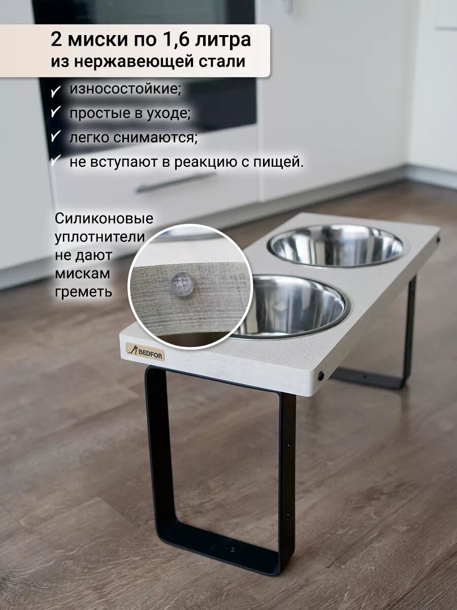 Подставка с мисками переменной высоты Loft легко трансформируется, позволяя изменять её высоту. Несколько уровней, на которых можно разместить миски для собаки – 9,5 см, 20,5 см и 28 см от пола до верхней части столешницы. Также есть альтернативное положение высотой 12,5 см, но в этом случае отверстия на металлических ободках будут сверху. Теперь Вам не нужно думать, подставку какой высоты покупать для питомца. Очень актуально это для владельцев тех собак, которые еще растут и пока не достигли своего максимального размера. На первом уровне (высота 9,5 см) подставка подойдет для щенков средних и крупных пород; на втором уровне (высота 20,5 см) – для взрослых средних собак, таких как cиба-ину, французский бульдог, бигль, кокер-спаниель, бассет-хаунд; на третьем уровне (высота 28 см) – для взрослых крупных собак, таких как лабрадор, овчарка, хаски, шарпей, чау-чау, питбуль, колли, ретривер. Столешница выполнена из массива берёзы – дерева, отличающегося высоким качеством и долговечностью. Покрыта премиальным маслом, предназначенным для контакта с пищей. Поэтому оно абсолютно безопасно для вашего питомца. Масло пропитывает верхний слой, создавая защиту от влаги и подчеркивая красивую фактуру дерева. Ножки подставки выполнены из металла. Они покрашены устойчивой к царапинам краской. На дне ножек размещаются силиконовые вставки, не позволяющие подставке скользить и защищающие покрытие пола. Миски по 1,6 л каждая изготовлены из нержавеющей стали, очень практичного материала; они легко моются и долго служат. На столешнице есть уплотнители, которые не позволят мискам дребезжать. Подставка довольно тяжелая (~4 кг), что в совокупности с силиконовыми демпферами на ножках не позволит Вашему питомцу двигать её во время еды. Наши миски для собак идеально впишутся в интерьер любого дома, а Ваши четверолапы по достоинству смогут оценить их удобство и экологичный дизайн. Вам не придется выбирать между красотой и функциональностью. Наши миски - проявление Вашей заботы о питомце.