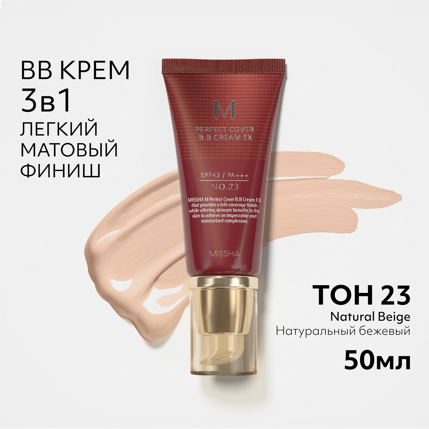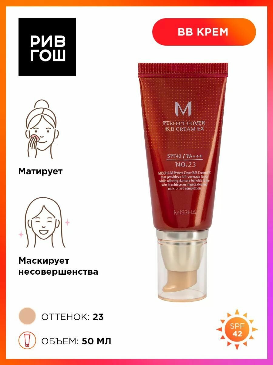 MISSHA Тональный BB крем M Perfect Cover BB Cream Rx , No. 23 Neutral Beige, 50 мл. Самый популярный бб-крем в мире. Обладает превосходными маскирующими качествами, длительным сроком использования (более 12 часов) и стойкостью. Успокаивающий и увлажняющий эффекты достигаются благодаря экстрактам водорослей, розмарина и ромашки, а также комплексу масел жожоба и макадамии. В число активных компонентов входят арбутин, аденозин, гиалуронат натрия и коллаген. Натуральное «невидимое» покрытие, великолепный маскирующий эффект благодаря прекрасному покрытию, отбеливанию пигментных пятен, интенсивному увлажнению, улучшению текстуры кожи благодаря растительным экстрактам и питательным ингредиентам. Благодаря своему составу крем поддерживает тонус кожи, делает кожу упругой и подтянутой, хорошо увлажняет, питает кожу витаминами. Благодаря экстракту ромашки, крем обладает заживляющим и успокаивающим эффектом. Активные ингредиенты: Аденозин – избавляет от морщин, ускоряет циркуляциюкрови, замедляет процесс старения. Арбутин – является препятствием для образования большого количества пигментации, выравнивание и осветление кожи. Гиалуроновая кислота – глубоко питает все слои кожи, разглаживает морщины, надежно защищает кожу от пересыхания. Гидролизованный коллаген – стимулирует регенерацию волокон коллагена, который содержится в коже, замедляет процессы старения, разглаживает кожу в любом возрасте. Экстракт икры – омолаживает и увлажняет, повышает упругость, пробуждает «уснувшие» клетки. Экстракты розмарина и ромашки – успокаивают кожу, устраняют любые раздражения. Результат: Увлажненная кожа, ровный тон, стойкий макияж. Способ применения: Нанести необходимое количество крема на кожу и равномерно распределить по лицу, используя специальный спонж, кисть или подушечки пальцев. Для лучшего эффекта, после нанесения подождать 5-10 минут, чтобы крем адаптировался на коже. После продолжить нанесение макияжа. Состав: WATER (AQUA), CYCLOMETHICONE, ETHYLHEXYL METHOXYCINNAMATE, ZINC OXIDE, PROPYLENE GLYCOL, TITANIUM DIOXIDE, CAPRYLIC/CAPRIC TRIGLYCERIDE, PEG-10 DIMETHICONE, CETYL PEG/PPG-10/1 DIMETHICONE, ARBUTIN, MINERAL OIL, GLYCERIN, POLYETHYLENE, TALC, PHENYL TRIMETHICONE, BEESWAX (CERA ALBA), IRON OXIDES (YELLOW), SODIUM CHLORIDE, IRON OXIDES (RED), IRON OXIDES (BLACK), METHYLPARABEN, DIMETHICONE, PROPYLPARABEN, ROSA CANINA FRUIT OIL, SIMMONDSIA CHINENSIS (JOJOBA) SEED OIL, SQUALANE, HYDROLYZED COLLAGEN, MACADAMIA TERNIFOLIA SEED OIL, DISODIUM EDTA, ADENOSINE, CAVIAR EXTRACT, ALGAE EXTRACT, ROSMARINUS OFFICINALIS (ROSEMARY) LEAF EXTRACT, CHAMOMILLA RECUTITA (MATRICARIA) FLOWER EXTRACT, SODIUM HYALURONATE, FAGUS SYLVATICA BUD EXTRACT, CERAMIDE 3, FRAGRANCE (PARFUM), HYDROXYISOHEXYL 3-CYCLOHEXENE CARBOXALDEHYDE, BUTYLPHENYL METHYLPROPIONAL, BENZYL SALICYLATE, HYDROXYCITRONELLAL, ALPHA-ISOMETHYL IONONE, HEXYL CINNAMAL, LINALOOL, CITRONELLOL. Гибкая система оплаты и быстрая доставка нашего интернет магазина бытовой химии позволяет купить MISSHA Тональный BB крем M Perfect Cover BB Cream Rx , No. 23 Neutral Beige, 50 мл в Москве потратив всего несколько минут времени.