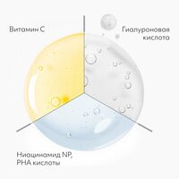 | Активный ингредиент | PHA-кислоты, витамин B3 (ниацинамид), витамин C (аскорбиновая кислота), витамин E, витамины, гиалуроновая кислота, коллаген, фуллерены |